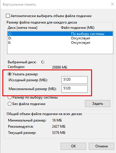 - В следующем окне выберите «Указать размер» и выберите желаемый объем файла подкачки (одинаковый в обоих окошках);