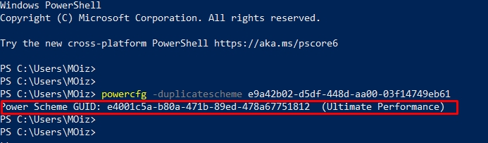 - Введите в командную строку «powercfg -duplicatescheme e9a42b02 -d5df -448d -aa00 -03f14749eb61» без кавычек и нажмите Enter. Если вы сделали все правильно, в консоли появится уведомление об успешной активации Ultimate Performance.