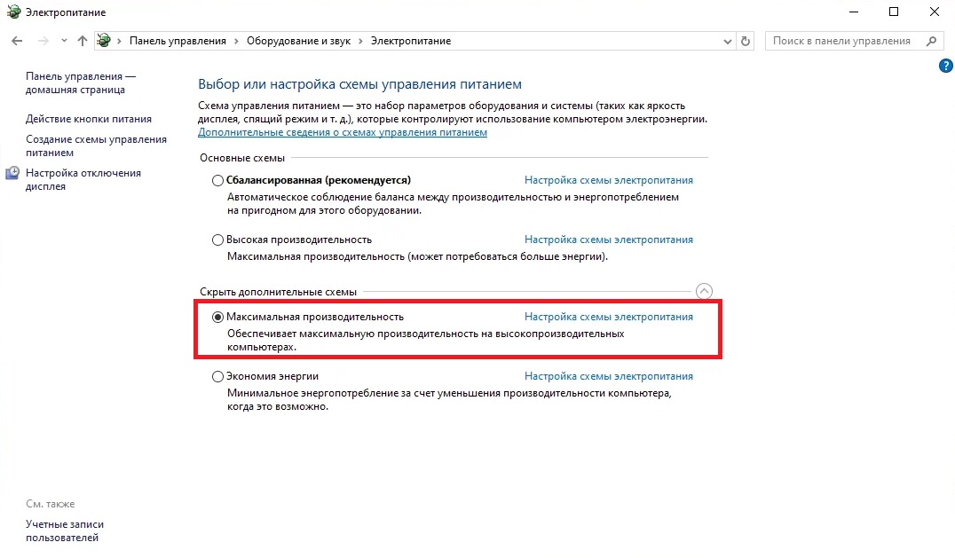 - Далее перейдите в параметры электропитания (Панель управления -> Мелкие значки -> Электропитание) и выберите в качестве активной схему управления питанием «Максимальная производительность».