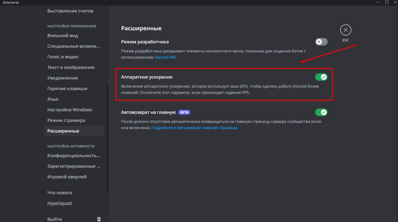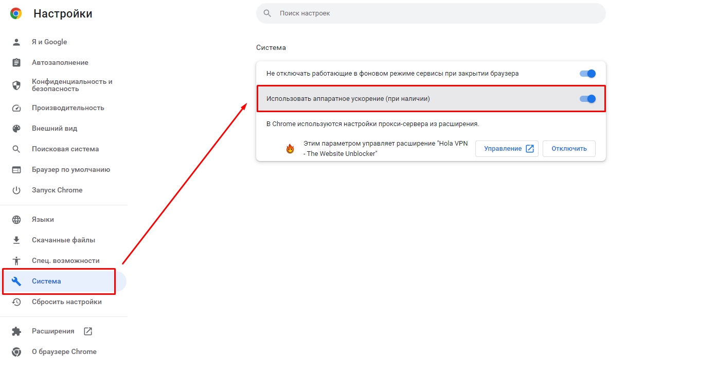 - Переместите кнопку рядом с пунктом «Использовать аппаратное ускорение (при наличии)» в положение выкл.