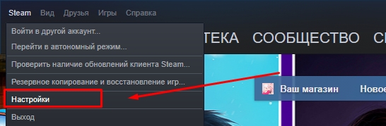 - В левом верхнем углу нажмите «Steam» и в выпадающем меню кликните по «Настройки»;