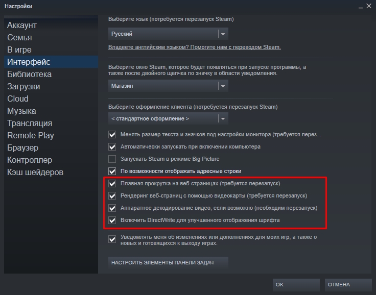 - В разделе «Интерфейс» снимите флажки с пунктов: