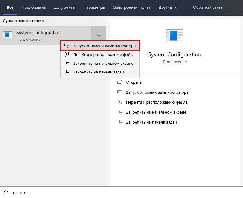 - Введите в поиске на компьютере msconfig и запустите программу от имени администратора;