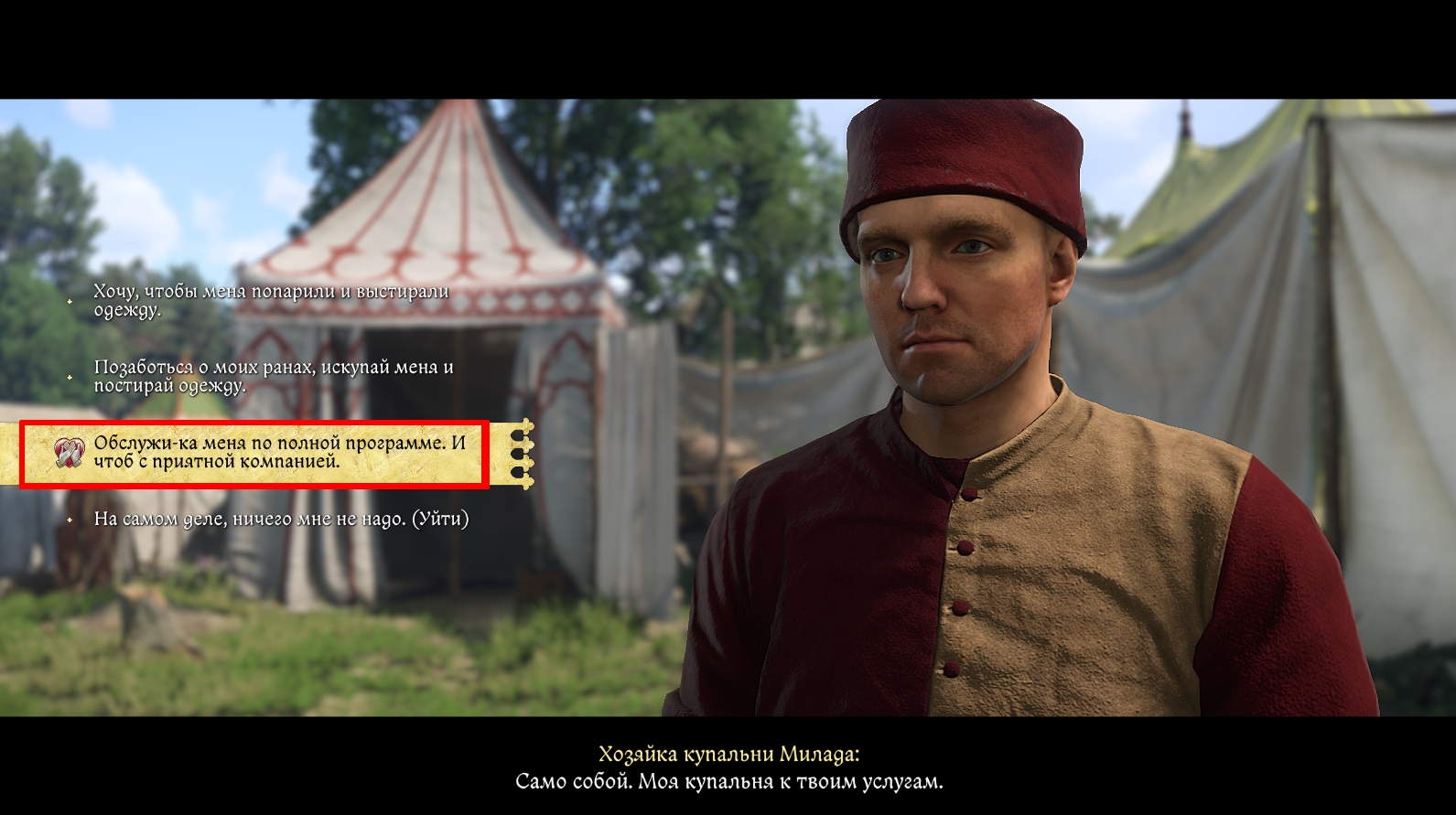 Чтобы получить бафф «Хорошо проведенное время», поговорите с любой хозяйкой купальни и выберите вариант диалога с красным сердечком. После этого женщина скажет, что за качественно оказанную услугу придется заплатить. Стоимость зависит от репутации протагониста в текущем регионе и находится в пределах 30 монет.
