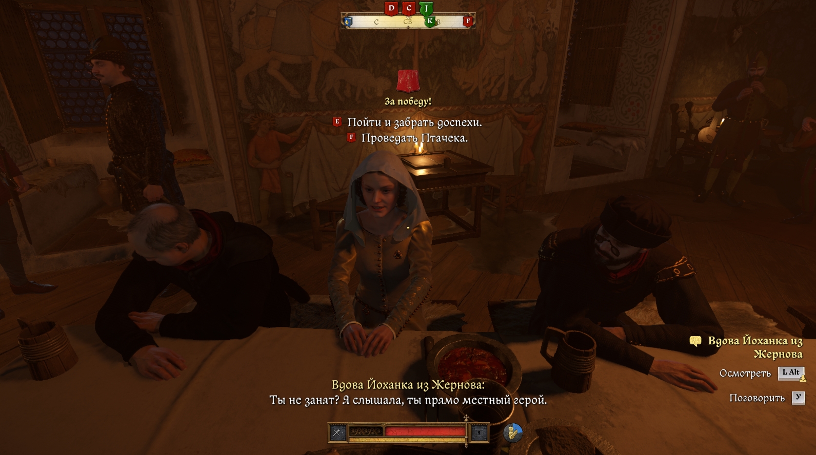 Приступив к выполнению квеста «За победу!», дойдите до момента, когда все ключевые лица соберутся в пиршественном зале (после разговора с Яном Птачеком). Когда кат-сцена закончится, осмотрите присутствующих и найдите за одним из столов Йоханку.