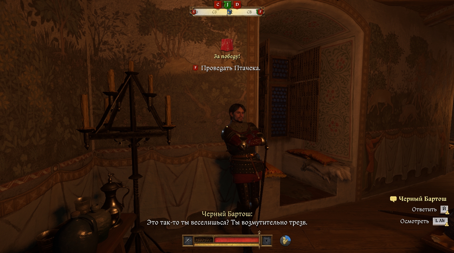 Обратите внимание! Чтобы развить отношения с этим человеком, вам нужно разыскать его рядом с ристалищем в замке Троски ДО начала пира в рамках квеста «За победу!» и попросить его обучить главного героя навыкам фехтования. Если этого не сделать, Бартош не будет расположен к откровенному диалогу в пиршественном зале.