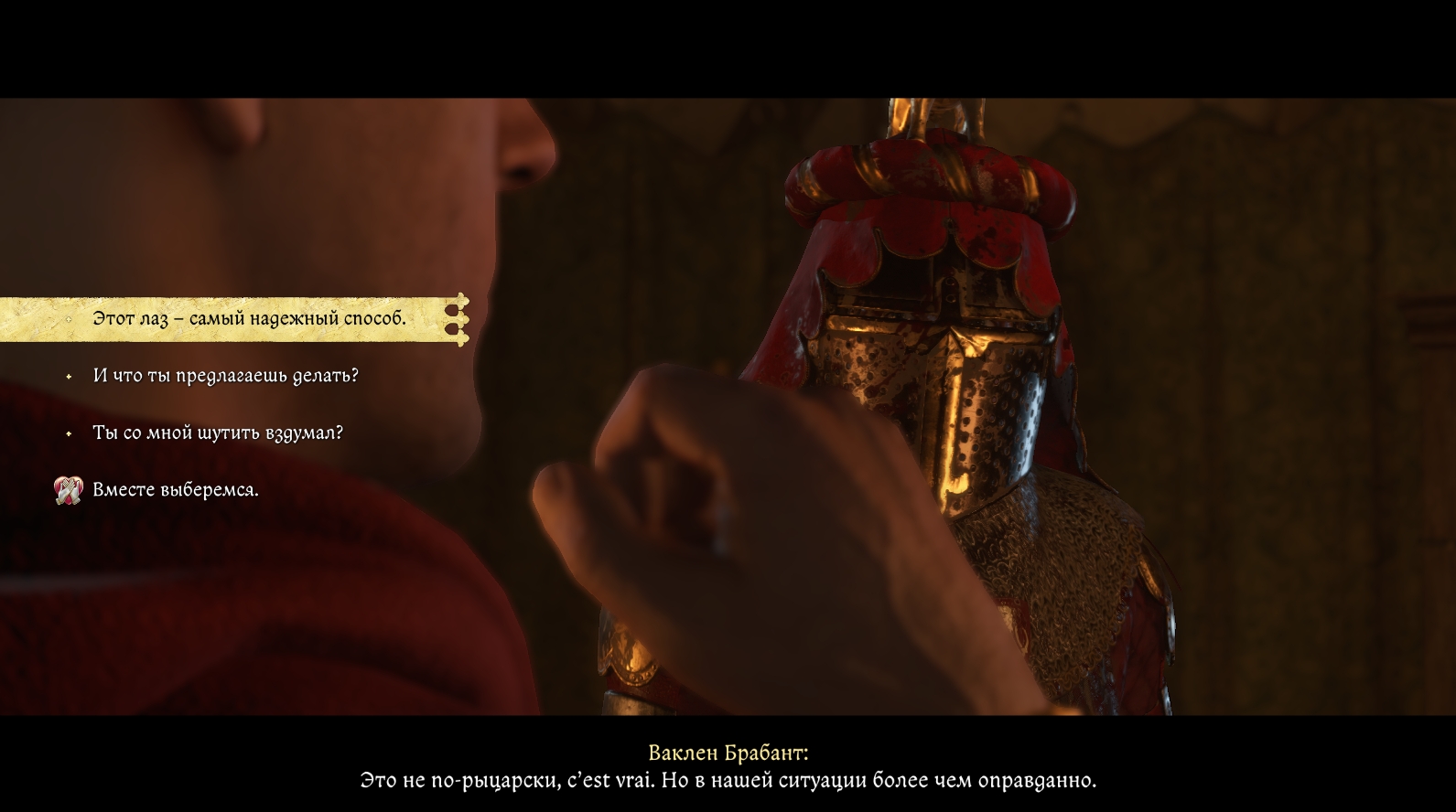После этого продолжайте делать сюжетные задания, пока не доберетесь до миссии «Уйти по-французски» в регионе Кутна-Гора. Найдите молодого пана в крепости Малешов и в ходе беседы выберите строку: