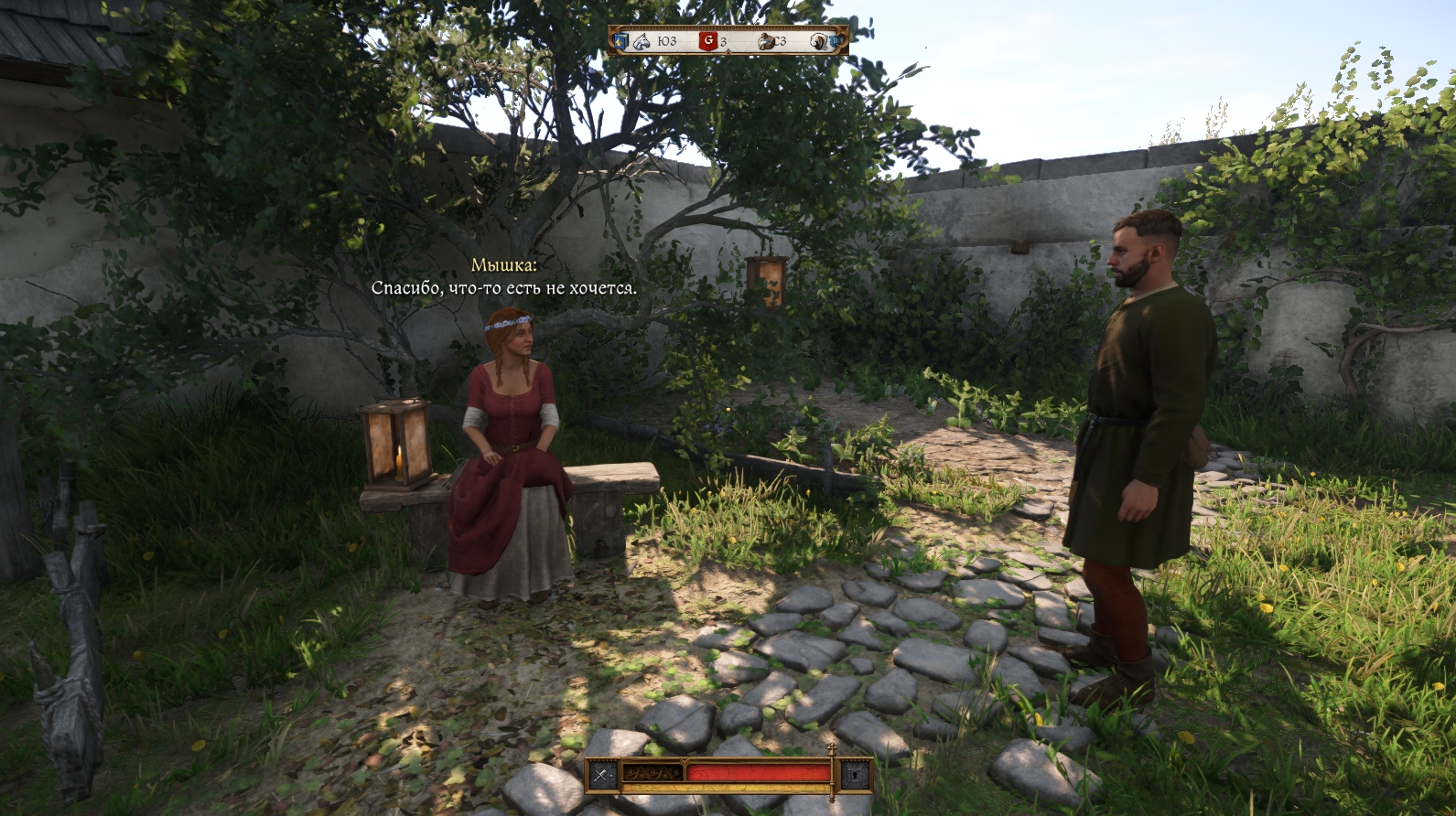 - «Был чудесный день, чтобы искупаться»/«Пан Гануш поручил нам доставить некое послание»/«Маркграф Йост хочет положить конец войне». Эти варианты требуют прохождение проверок «Внушительности», «Учености» и «Красноречия» соответственно. Выбирайте то, что вам больше подходит.
