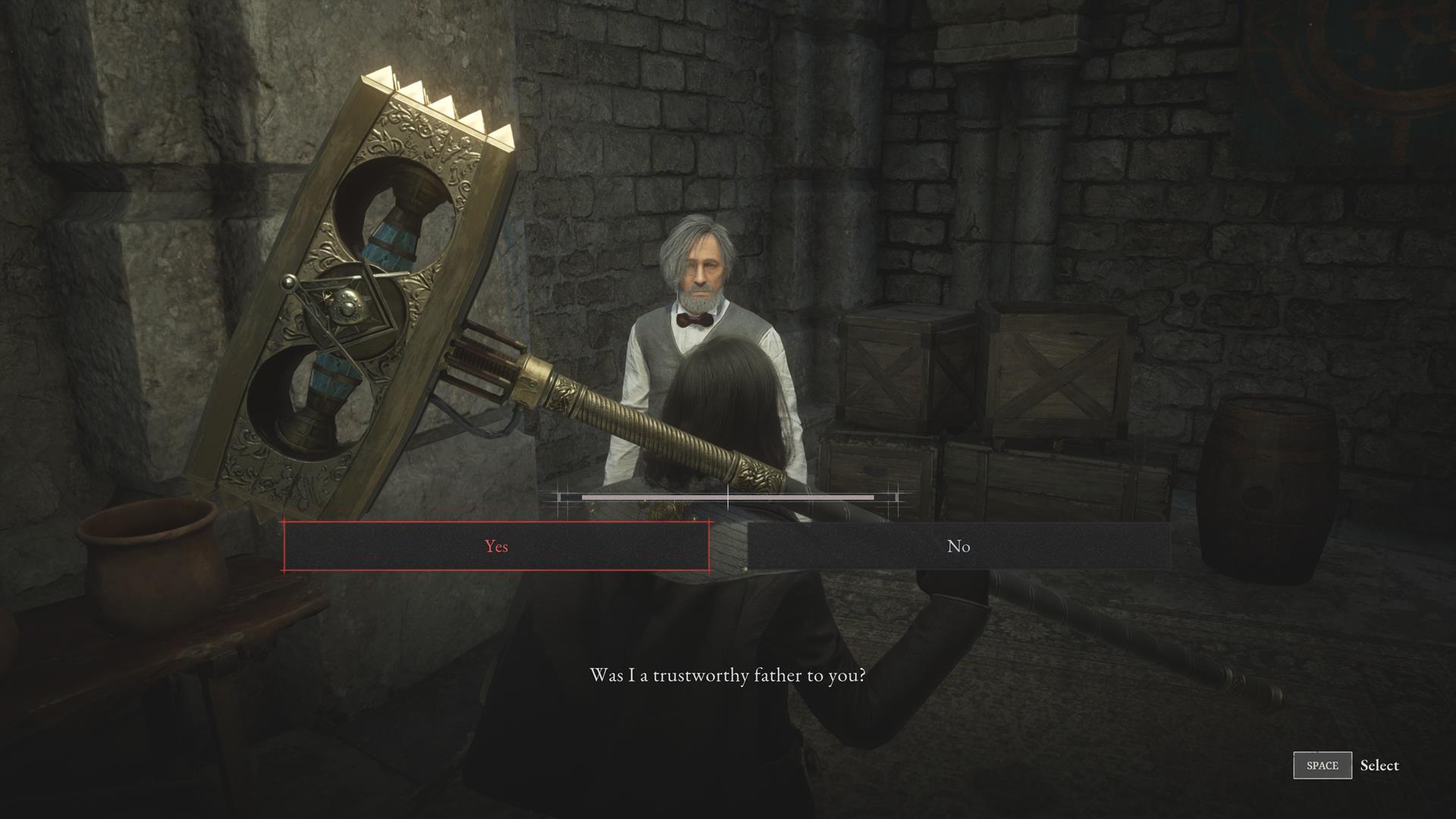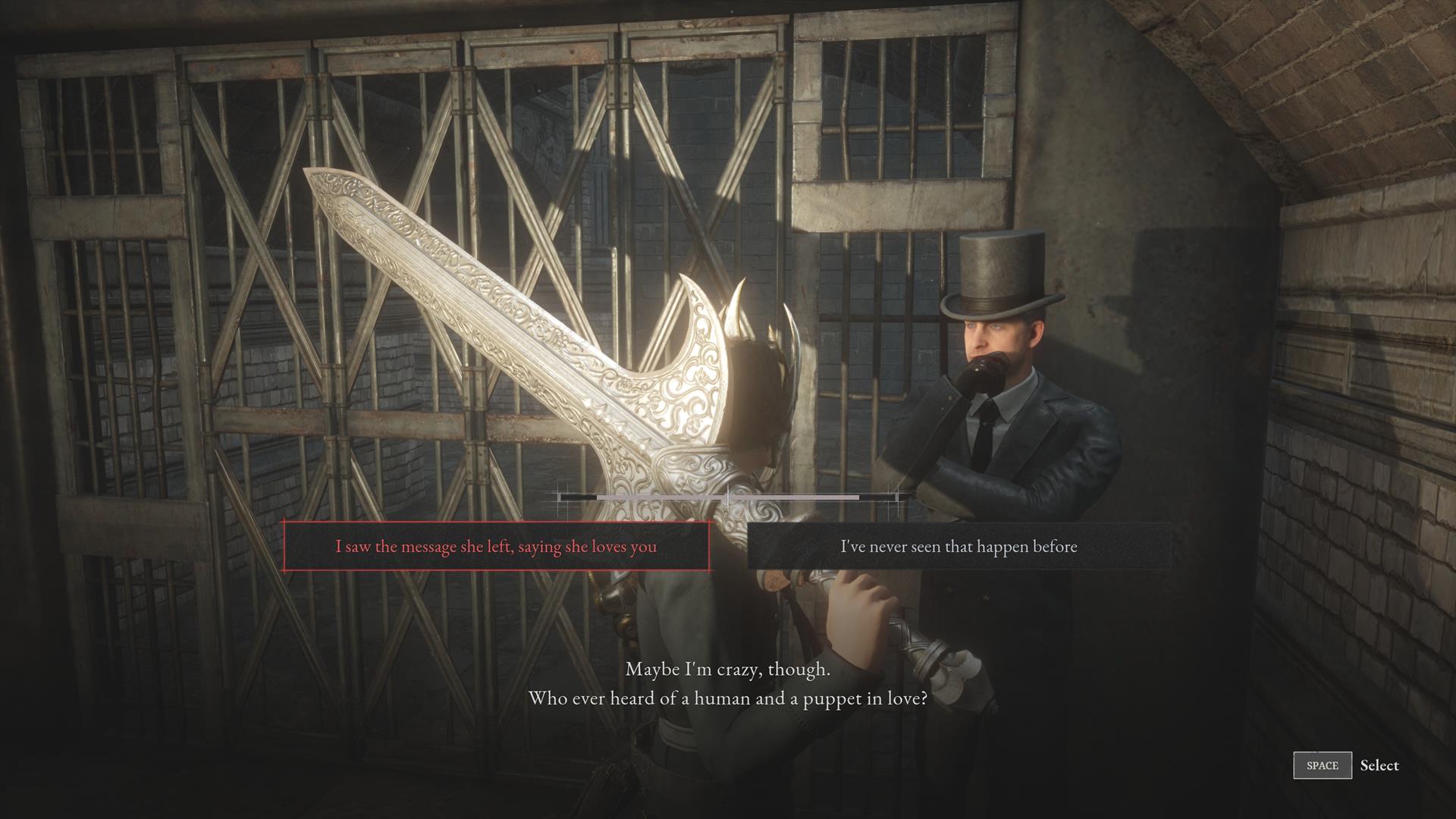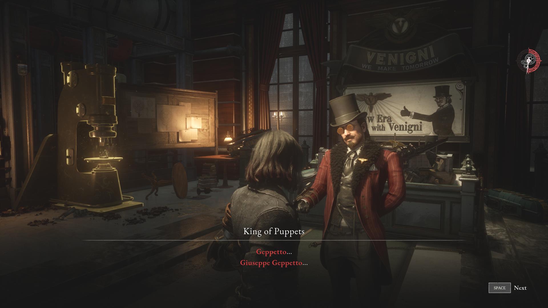 Джеппетто, который устроил марионеточное безумие, вы найдете в тюрьме. От него главный герой узнает, что Симон хочет впитать собранное эрго, чтобы превратиться в бога. Создатель Пиноккио спросит, заслуживает ли он доверия? Сделав выбор, вы откроете разветвленный диалог с мужчиной. В целом, ваше решение никаких особых изменений в сюжет не внесет, поэтому можете или соврать ему, или сказать правду.
