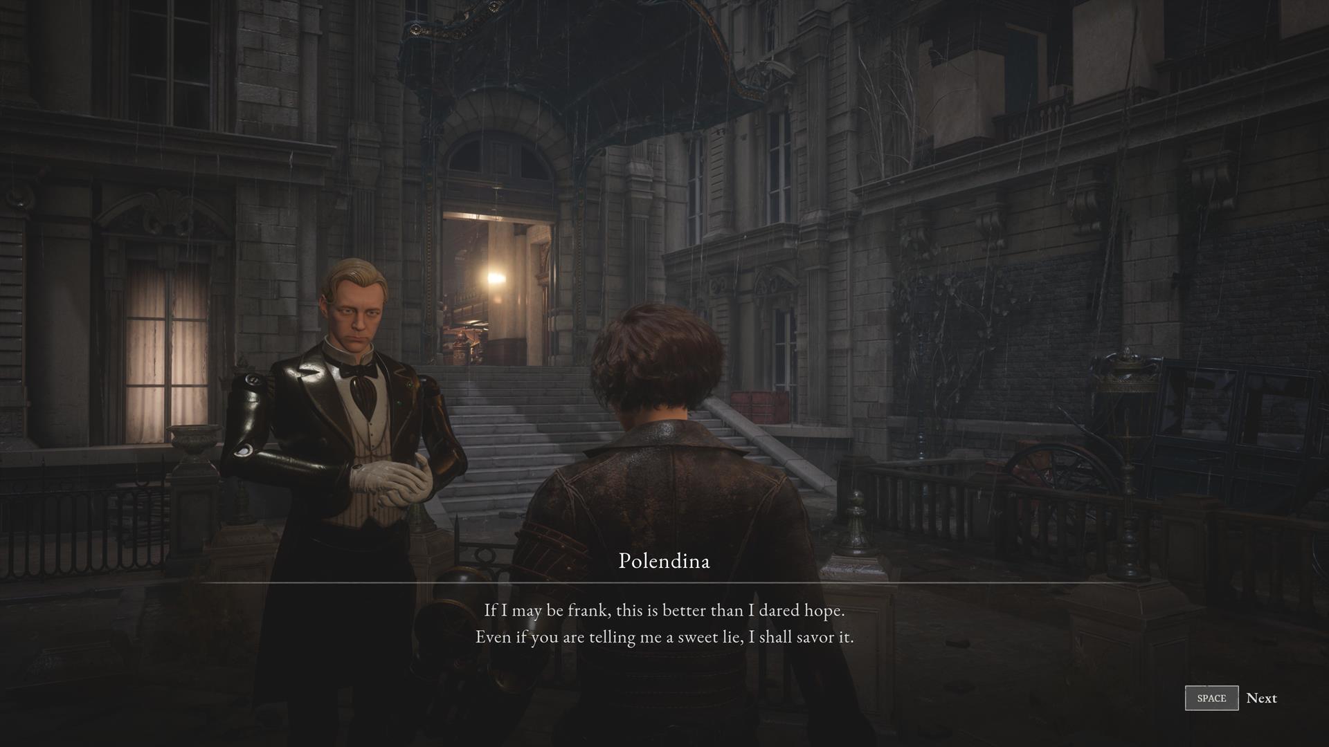 Если, помогая Господину Джулиану, вы соврали ему, у вас будет возможность найти в отеле «Крат» Полентина. Идите к нему после беседы с Антонией и начните разговор. Как и Джулиан, Полентина хочет знать, может ли быть любовь между человеком и марионеткой? Ложь – скорее всего то, что желает услышать мужчина, но демонстрация обручального кольца принесет ему некое утешение. Меж тем, вы получите расходуемый предмет «Стальная защита Джемини» вне зависимости от сделанного выбора.