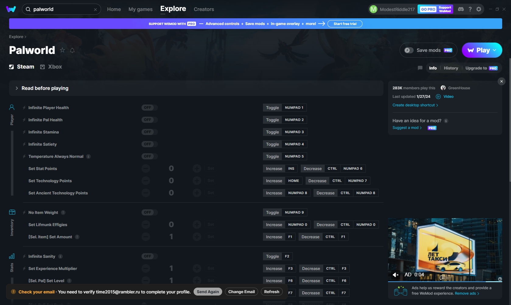На сегодняшний день трейнер для Палворлд от разработчика FLiNG включен в сборник читов WeMod. Он объединил в себе следующие функции: