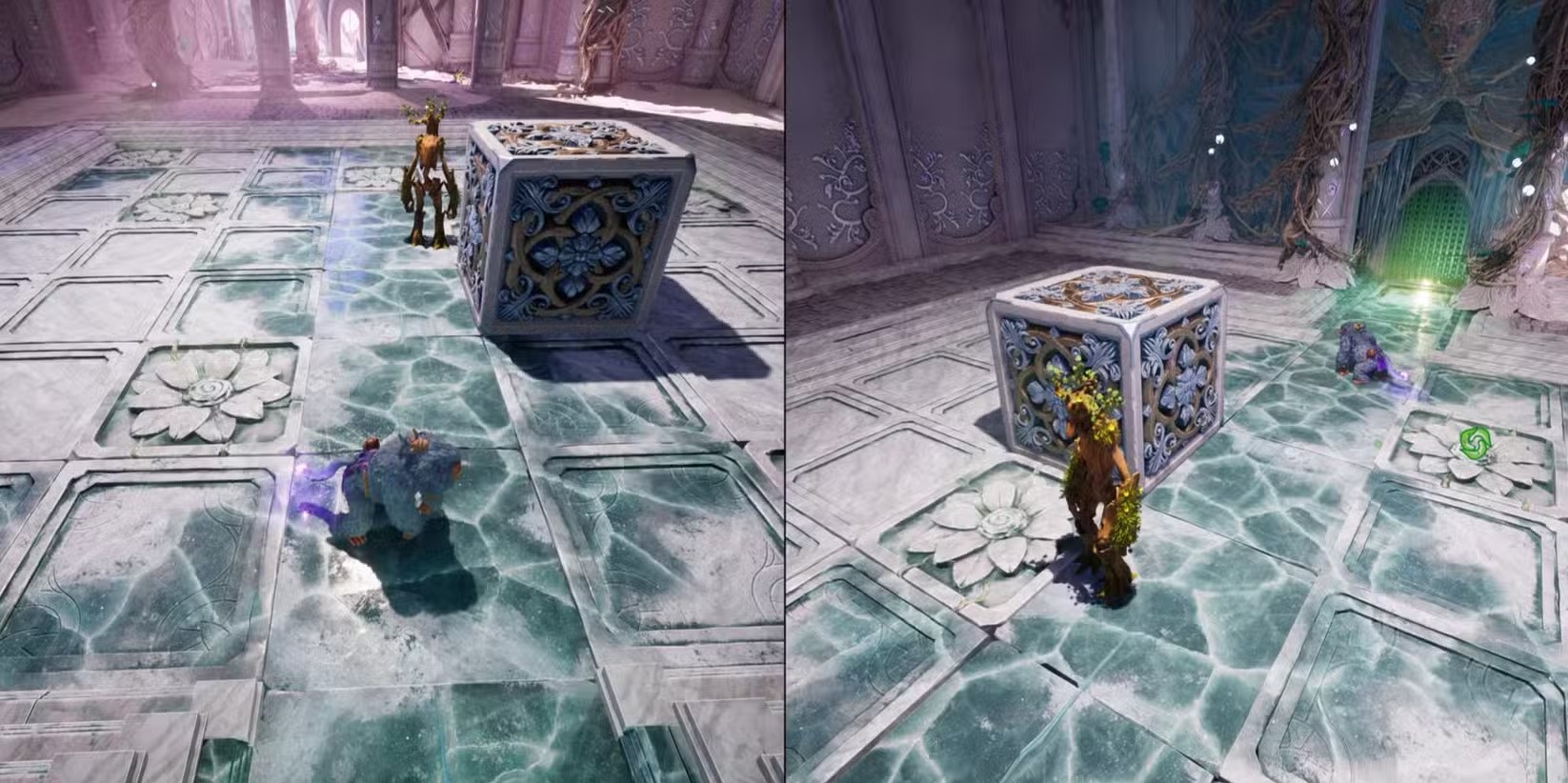 Хотя решение загадки звучит максимально просто – затолкать ледяной куб в ворота, сделать это не так-то легко. Загвоздка заключается в том, что главный объект будет двигаться по прямой до тех пор, пока не встретит на своем пути препятствие. Естественными препятствиями становятся стены, однако таким образом решить головоломку не получится. Ответ заключается в том, что преобразованные в новые формы Мио и Зои способны решить эту загадку следующим способом: находящаяся в форме обезьяны Мио будет толкать ледяной куб в нужном направлении, в то время как Зои своей способностью, полученной в форме дерева, сможет приподнимать некоторые плиты на полу, создавая таким образом препятствия.
