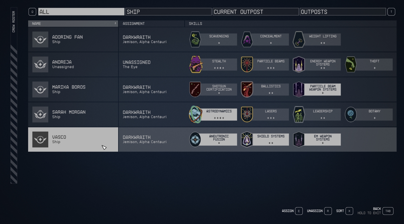 Также у спутников встречаются навыки, связанные с управлением или починкой корабля и форпостов. Нанимая члена команды, вы увидите его навыки в меню корабля (те, что соответствуют типу корабля, будут подсвечиваться). Хорошая команда улучшит ваш корабль до невиданных высот (усилит наносимый урон, укрепит щиты, увеличит объем грузового отсека и так далее). Внимательно читайте описание навыков и поручайте спутникам ту работу, к которой они приспособлены.