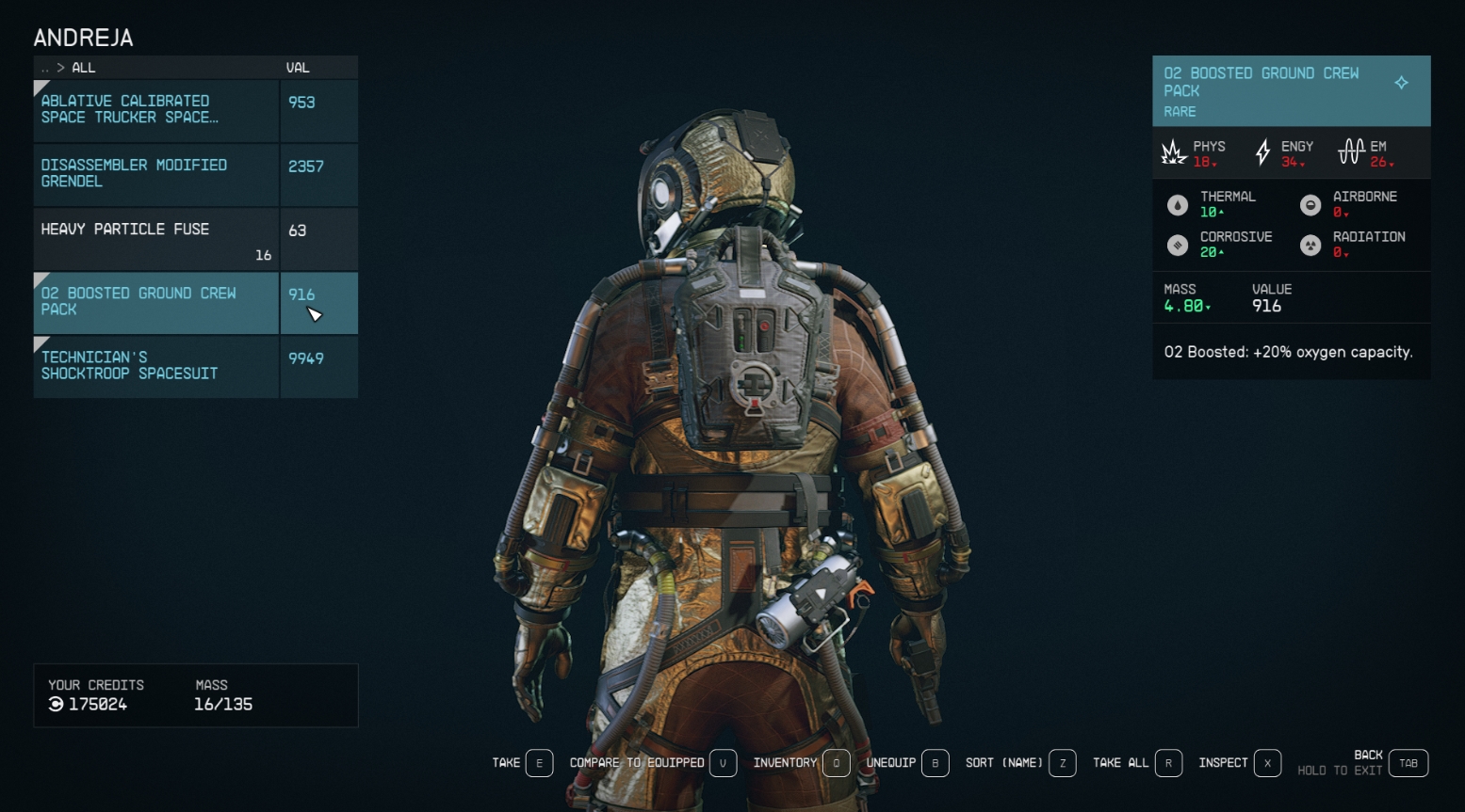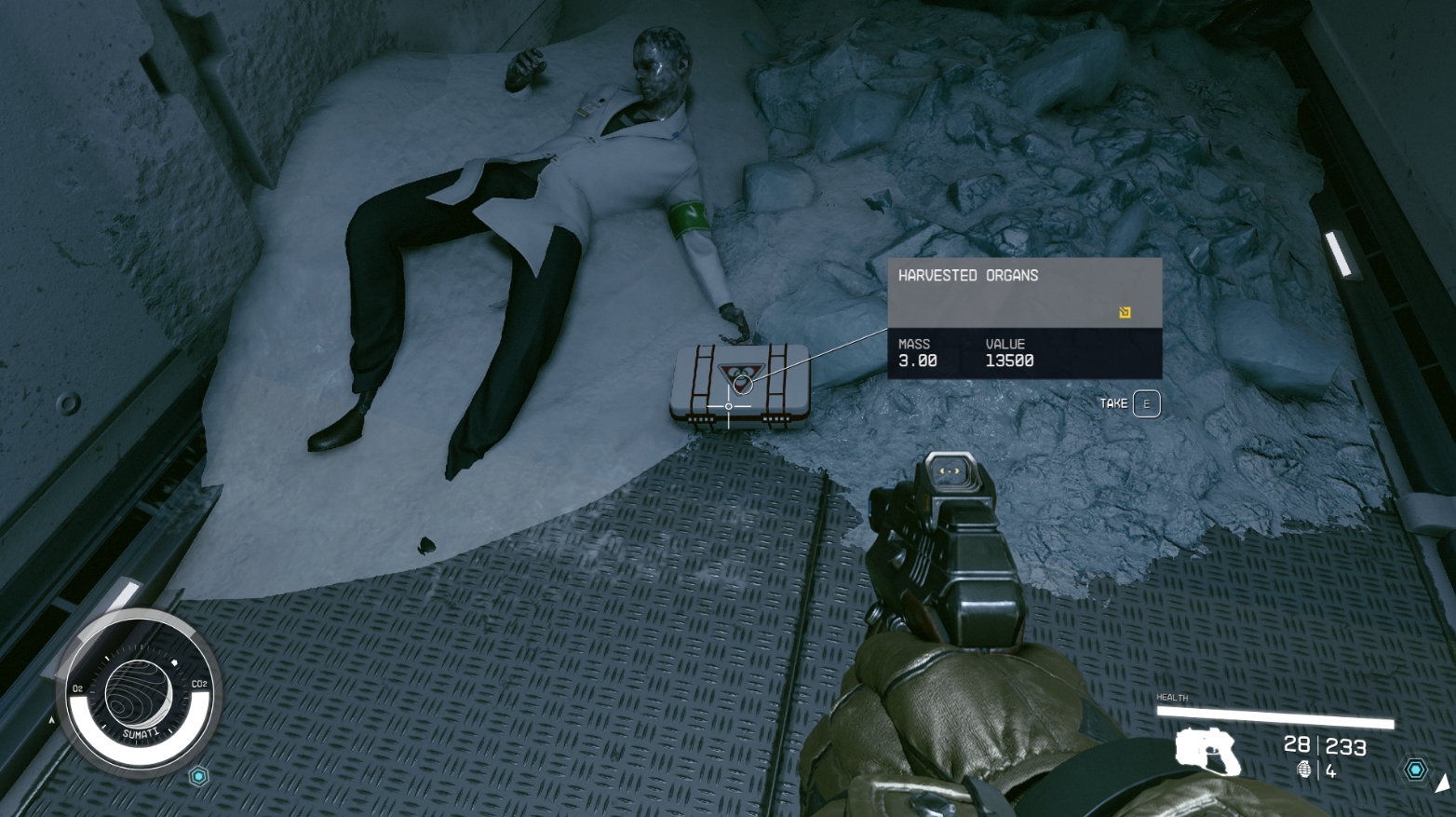 У стартового корабля имеется грузовой отсек, туда можно сложить материалы и ресурсы, которые вы не можете унести. Доступ к грузовому отсеку можно получить разными способами, самый простой - через небольшой терминал, расположенный слева от кресла пилота. В игре предусмотрена горячая клавиша, позволяющая моментально сгрузить все ресурсы в отсек (T на ПК, RB на Xbox).