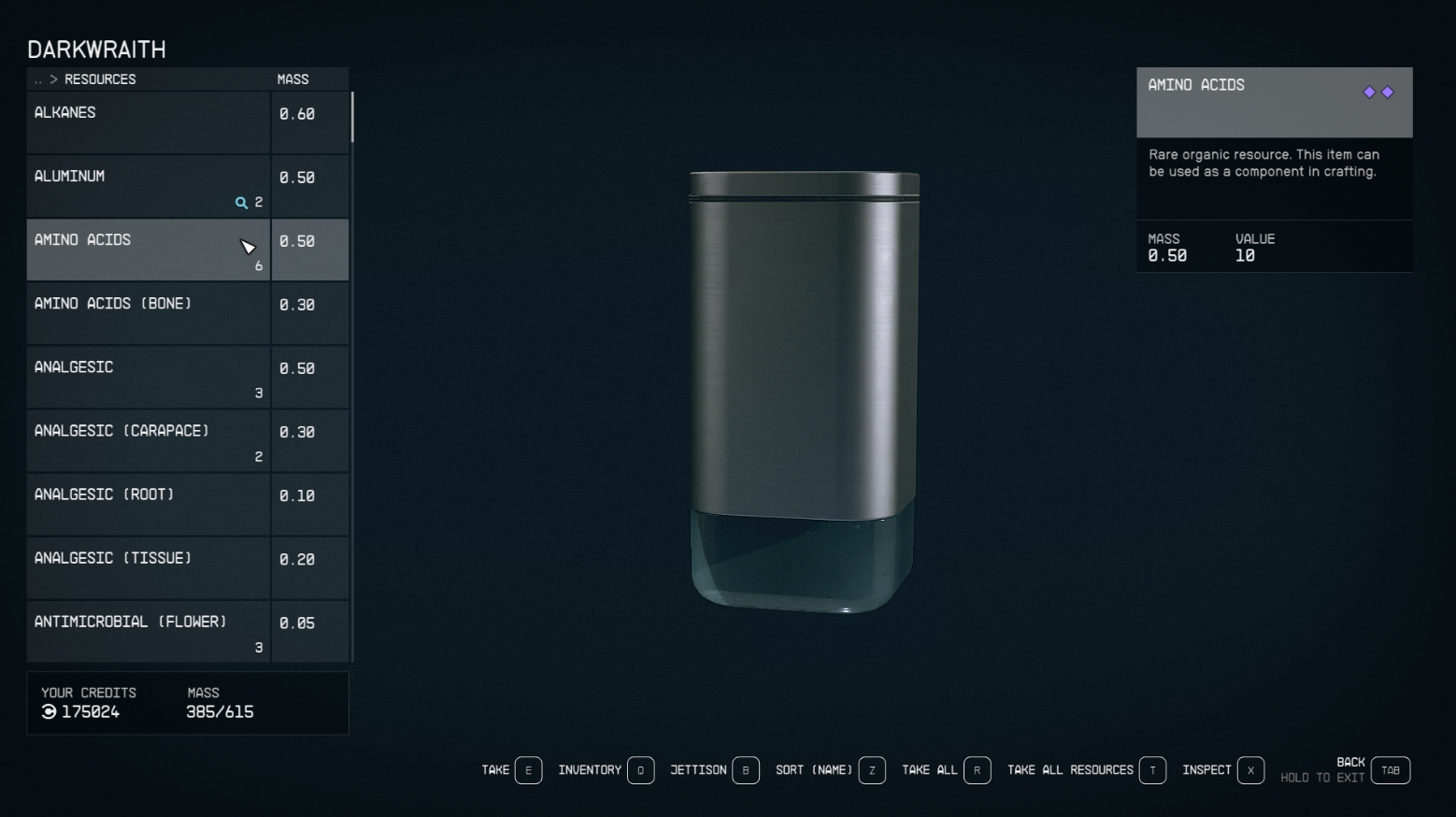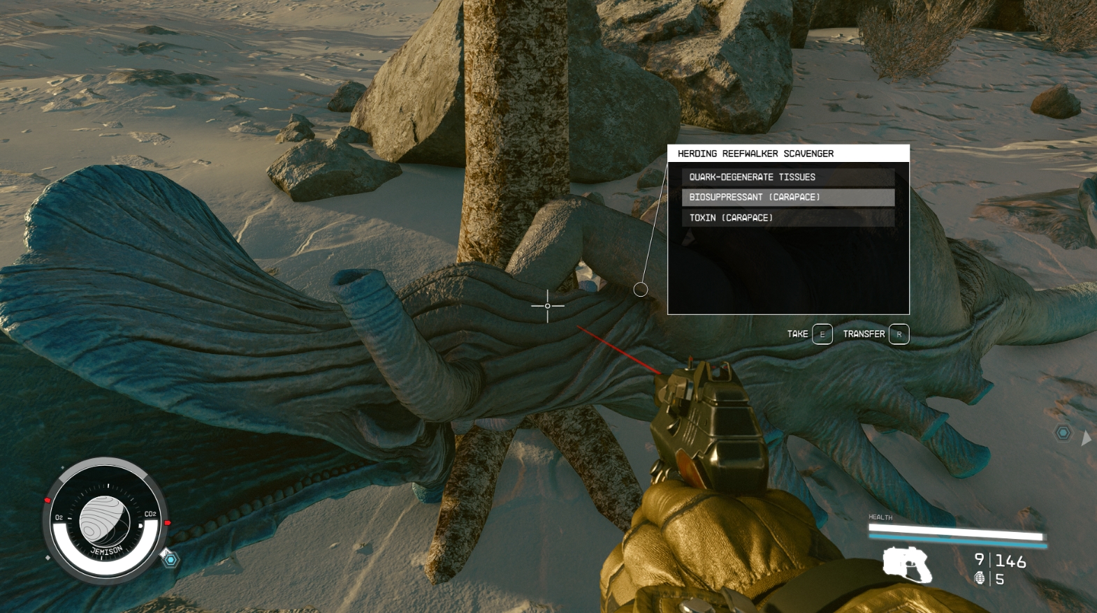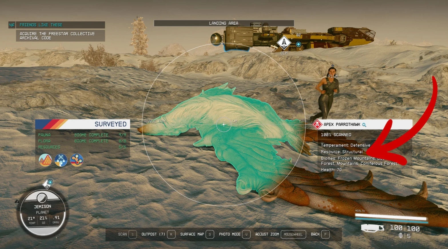 Не менее важно знать, какие ресурсы можно добыть с того или иного существа (позже, когда эти ресурсы вам понадобятся, вы будете знать, куда за ними лететь и кого там фармить). Сканировать можно не только существ, но и растения (к слову, материалы, добываемые с растений, весят гораздо меньше, чем те же самые материалы, добытые с монстров или найденные в лабораторных банках).