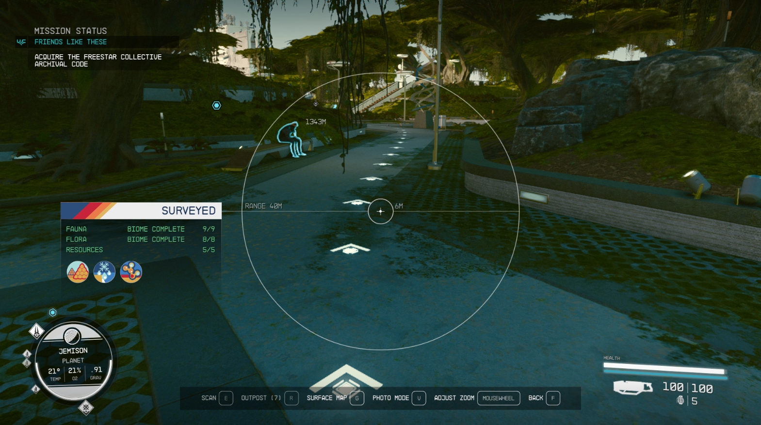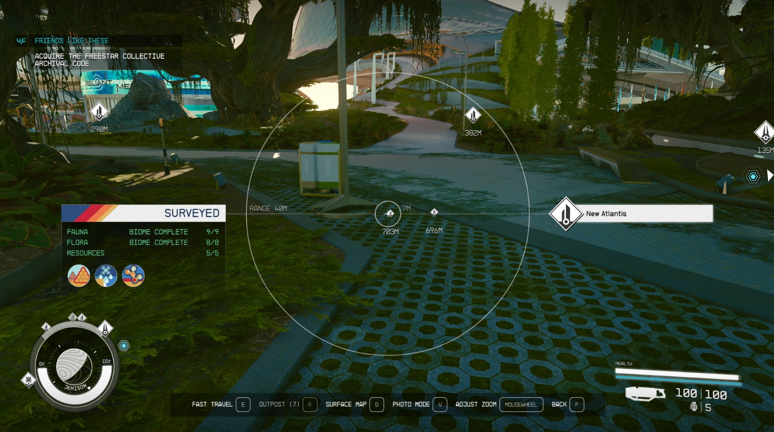 Включите режим сканирования, наведите сканер на нужную иконку и нажмите E на PC или A на Xbox, чтобы мгновенно переместиться в эту точку. Если вы находитесь на поверхности планеты, сканер поможет вам вернуться к кораблю или в один из кварталов города. Если вы находитесь на орбите, вы можете выбрать отмеченную точку на поверхности.