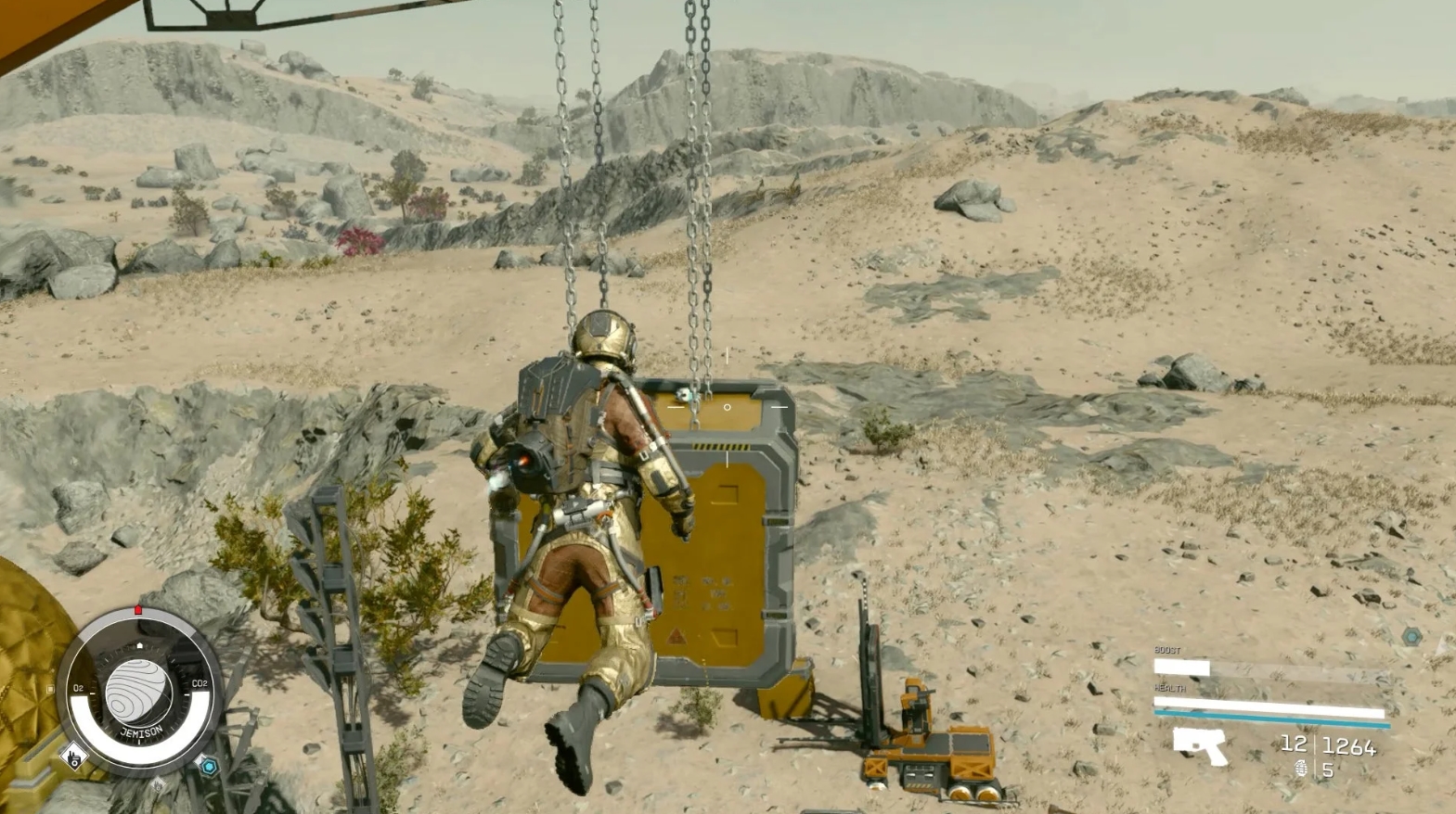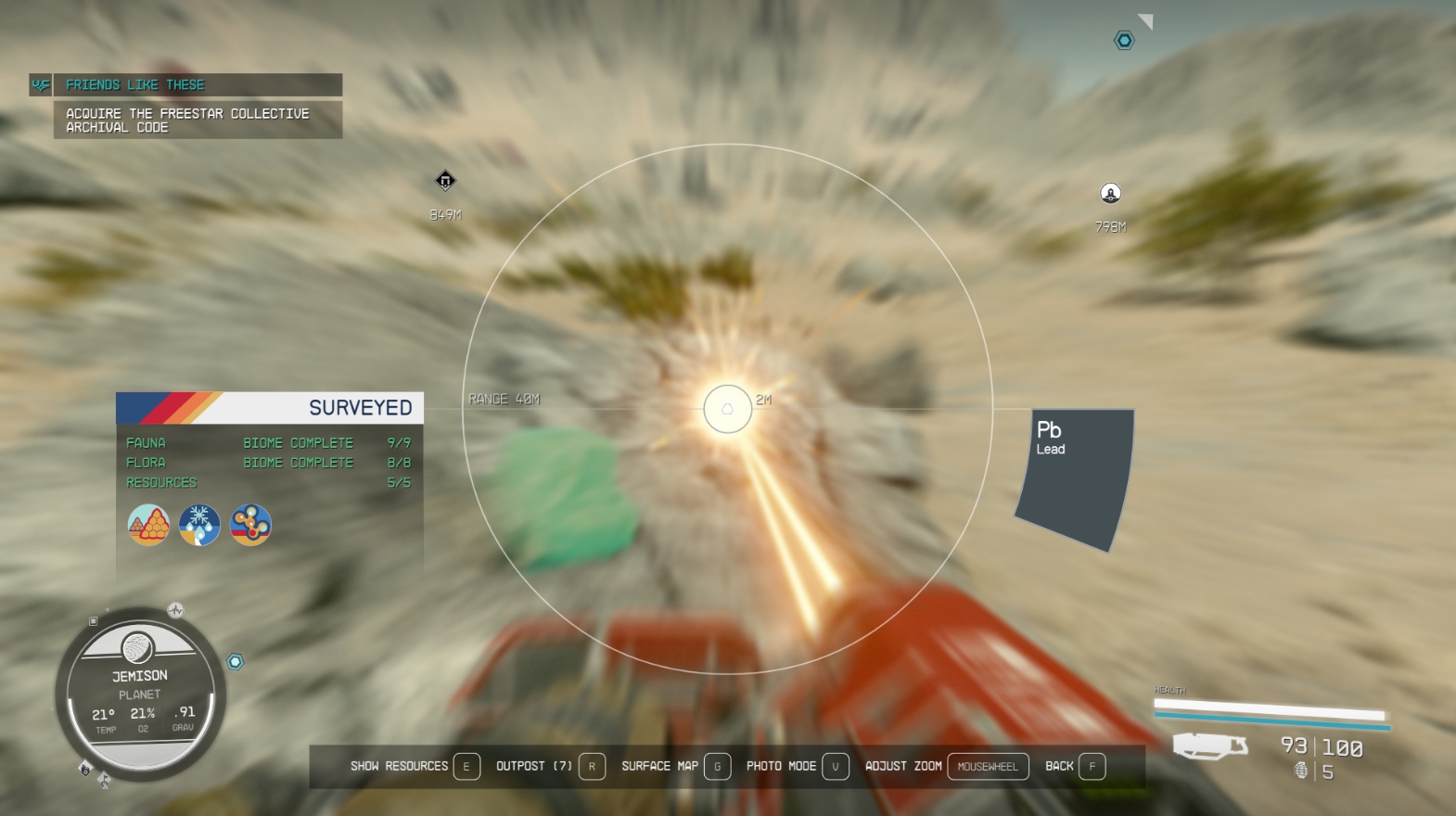 Используя кирку для добычи минералов, удерживайте кнопку ADS (ПКМ на ПК, LT на Xbox), чтобы зарядить луч и разработать месторождение быстрее. Зарядку можно определить по движению линий к индикатору в центре. Этот прием особенно полезен при быстром выполнении заданий по добыче минералов (в этом случае вы сможете потратить больше времени на исследования).