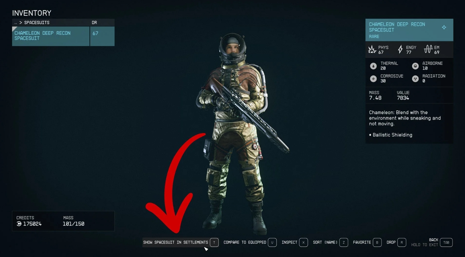 Если вы собрались в город и хотите выглядеть наилучшим образом, вы можете отключить отображение костюма и скафандра, не снимая их (и, следовательно, не теряя характеристик). Откройте инвентарь и найдите в нем вкладку Костюмы (Spacesuits), а затем выберите пункт "Показывать/скрывать костюмы в городах" (Show/Hide Spacesuit in Settlements), нажав клавишу T на ПК или кнопку RB на контроллере для Xbox. Если вы выберете второй вариант, ваш персонаж будет автоматически снимать костюм, оказавшись в безопасной зоне. То же самое можно сделать и для скафандра, однако сниматься от будет только если в зоне есть воздух, которым можно дышать. (Также в безопасных зонах можно зачехлять оружие, удерживая кнопку перезарядки.)