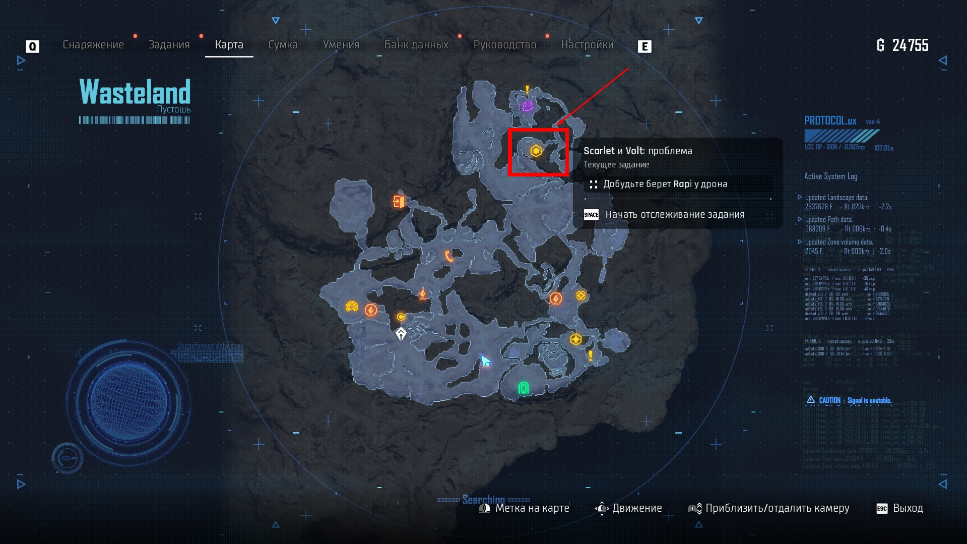 Задание выдает Scarlet – девушка в необычном костюме, которую можно найти во время исследования локации Пустошь. К ней Еву приведет механический пес Volt. Он находится тут: