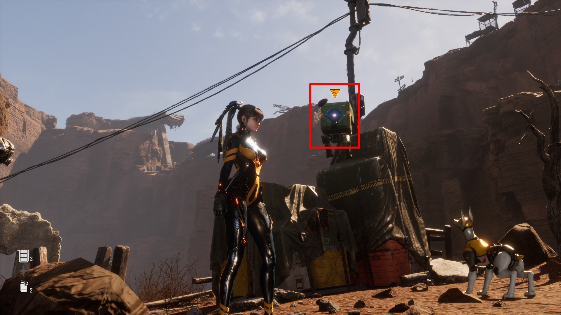 Когда вы окажетесь рядом с квестовой меткой, осмотритесь и найдите летающего над ящиками, укрытыми брезентом, дрона, который примеряет маленькую шапочку. Взаимодействуйте с ним, чтобы перейти в боевой сценарий.
