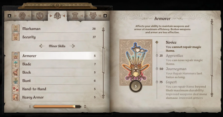 Есть еще на просторах игры The Elder Scrolls IV: Oblivion Remastered такой тип предметов как “Зачарованные”. Они достаточно могущественные и обладают дополнительными свойствами. Это их отличает от привычного обмундирования и требует особого подхода к починке (да, магическое снаряжение тоже ломается). Поэтому для самостоятельного ремонта необходимо будет иметь 25 уровень навыка “Оружейник”. Если он ниже, то вам в любом случае предстоит обращаться к кузнецам за помощью.