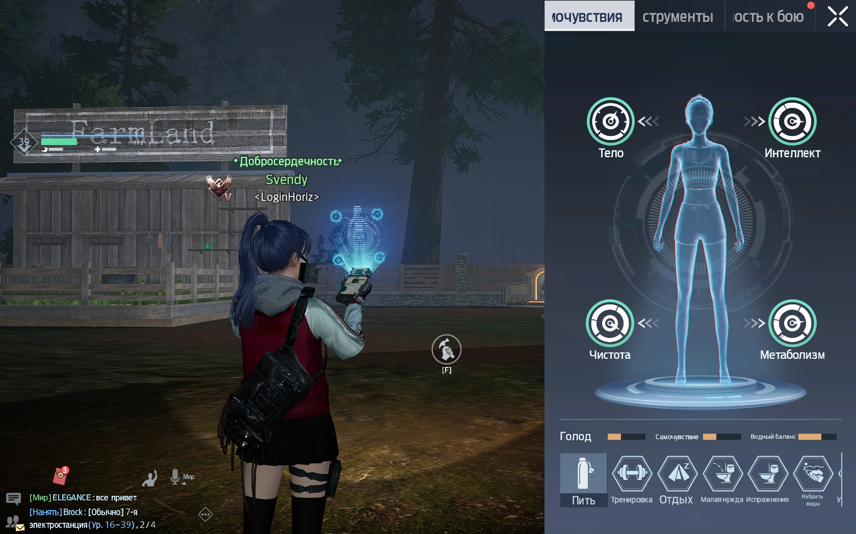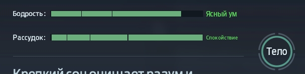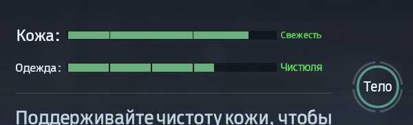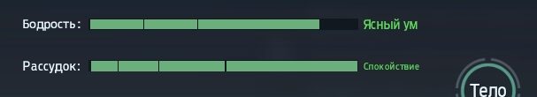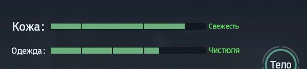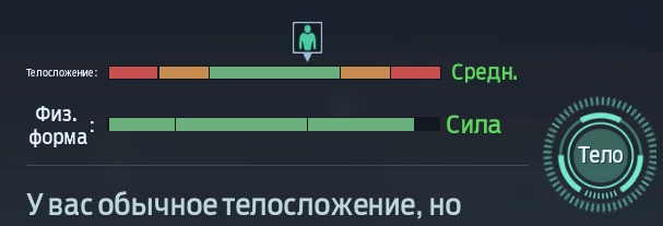 - Тело. Тип телосложения и уровень физ. подготовки очень важны. Они зависят от качества питания и частоты занятий спортом. Вовремя кормите героя и не забывайте выполнять упражнения, чтобы добиться превосходной физической формы, которая дает +15 к максимальному запасу энергии;