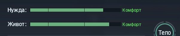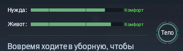 - Метаболизм. В эту категорию входит два параметра – «Нужда» и «Живот». Первый индикатор показывает, насколько сильно герой хочет сходить «по-маленькому», а второй – «по-большому». Обязательно вовремя посещайте уборную, чтобы он чувствовал себя в порядке. Также не забывайте регулярно пить воду, так как нормальный водный баланс сокращает затраты энергии на 10%;