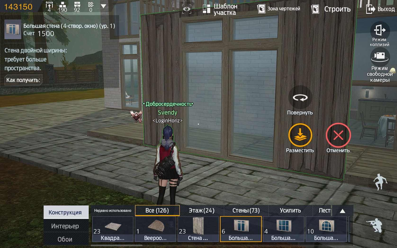 Доступ к режиму строительства можно получить, нажав клавишу F или кликнув по значку в виде молоточка, расположенного в центре экрана. Чтобы он появился, войдите на территорию своего убежища. В режиме строительства вы можете возводить стены, размещать предметы обстановки, оборудование, украшать свой участок и менять его по необходимости.