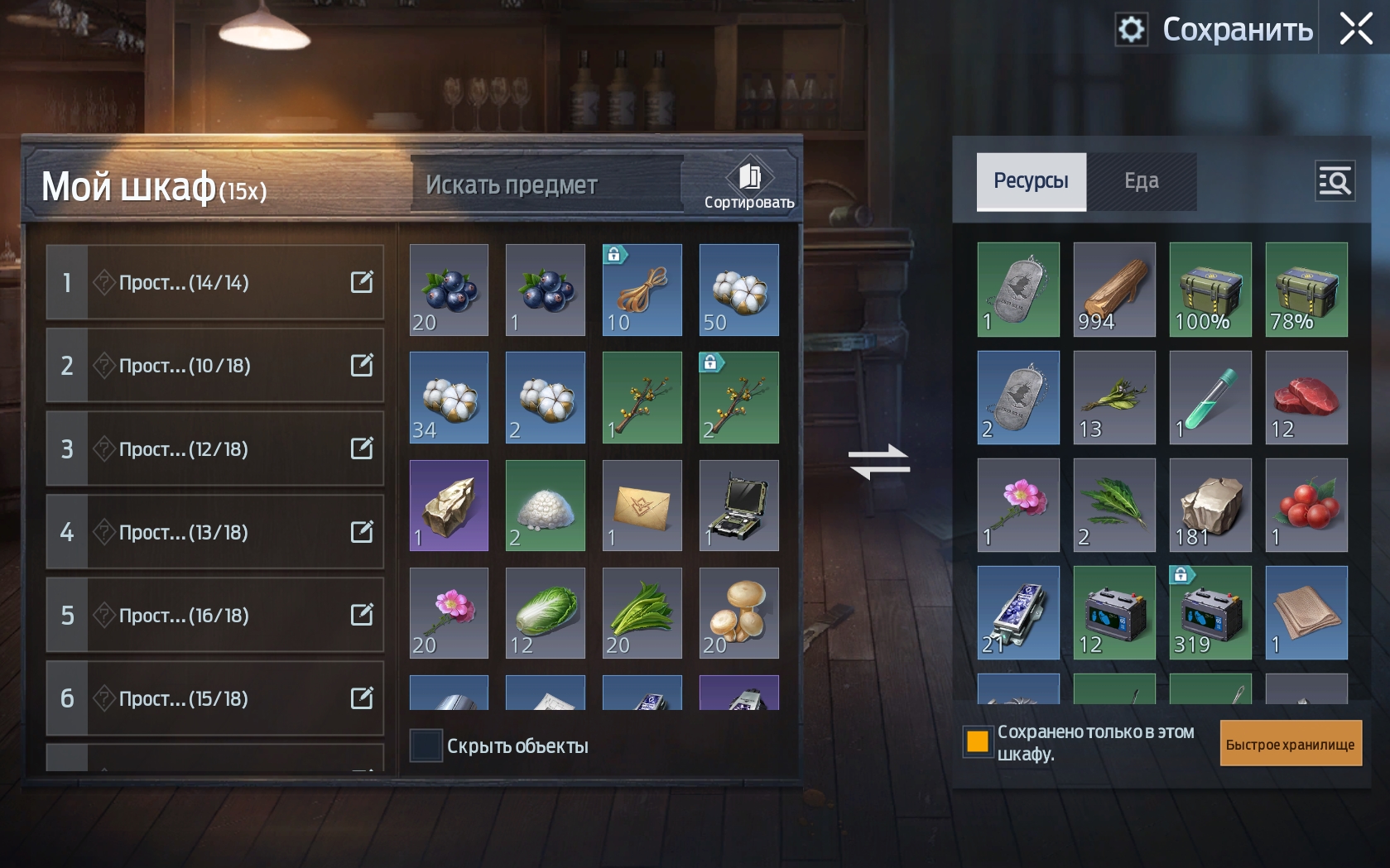 - Создайте много крупных шкафов (около 10 для начала). В них вы будете складывать ресурсы и прочие предметы, чтобы не засорять свой инвентарь. Обратите внимание на то, все ресурсы, которые находятся в хранилище, автоматически используются для крафта. Вам не нужно постоянно перекладывать их в рюкзак;