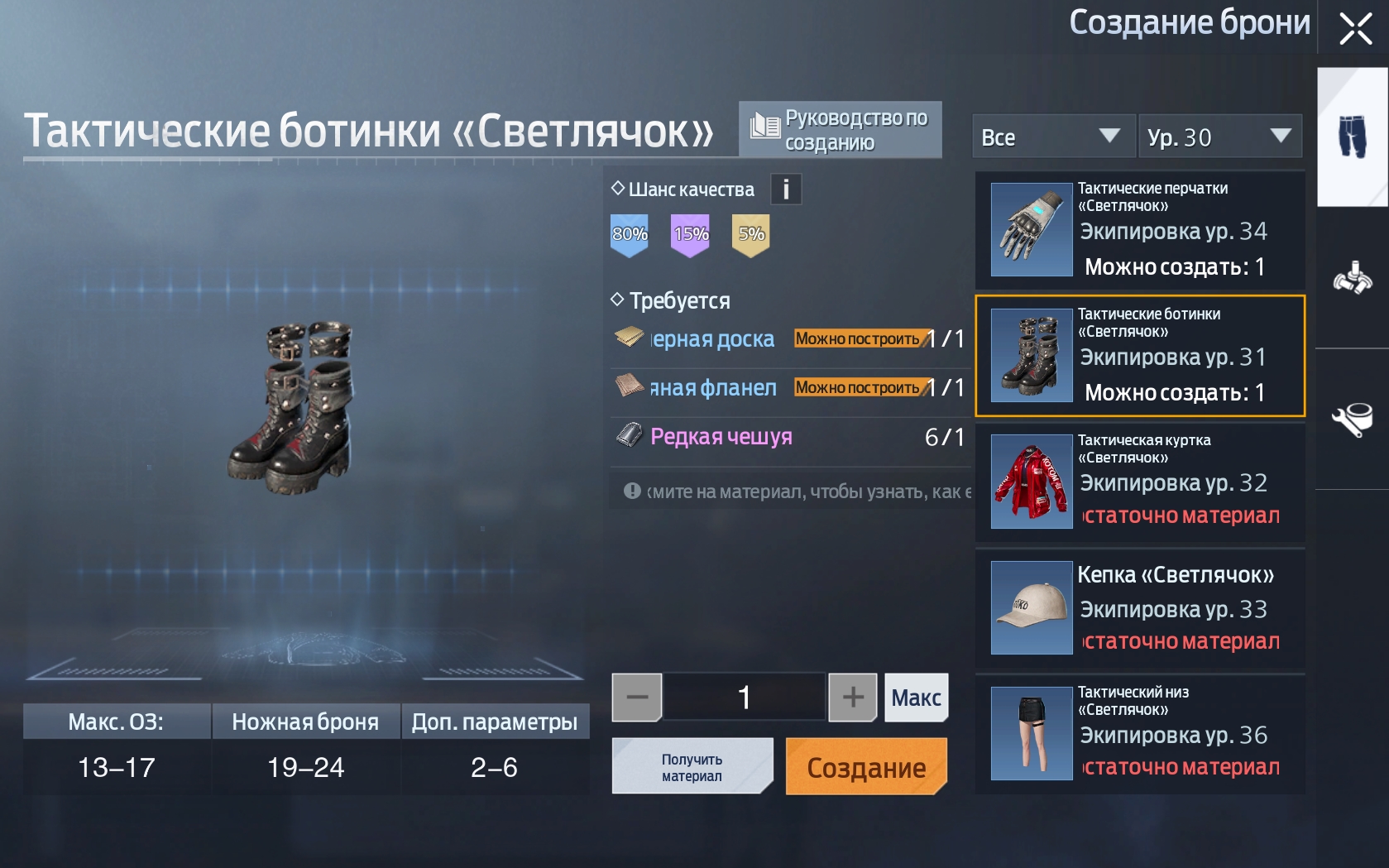 В основном снаряжение крафтится с синим типом качества, но с вероятностью в 15% вы получите фиолетовый предмет, а с шансом в 5% вам выпадет оранжевый.