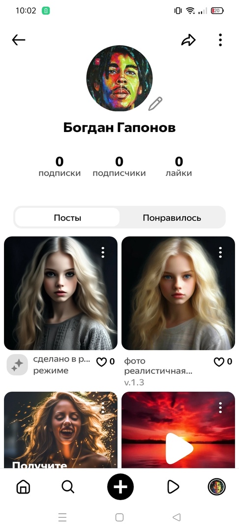 Посмотреть созданные изображения и другой контент можно на страничке аккаунта. Нажмите на свою аватарку справа внизу экрана и перейдите в раздел, где показаны ваши посты и контент других пользователей, который вам понравился.