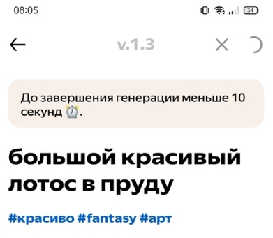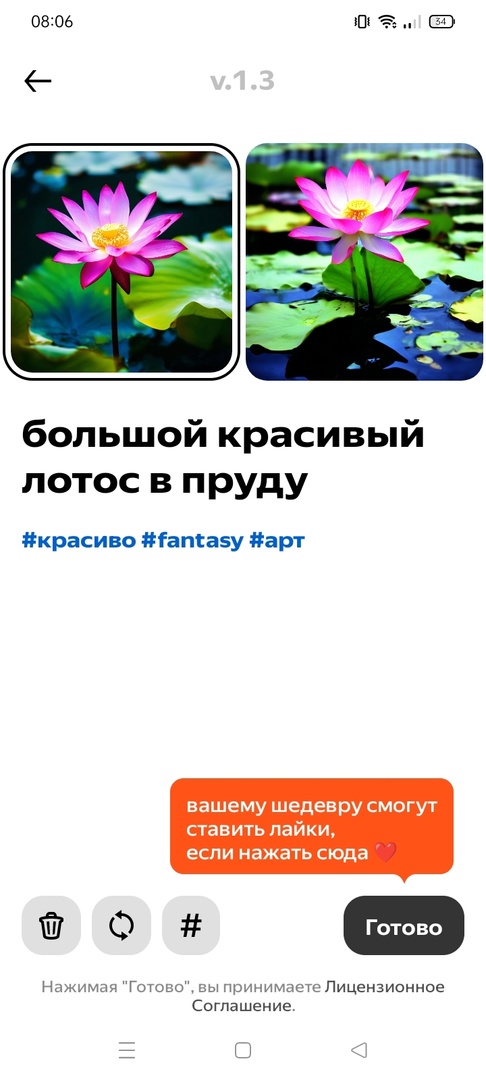 - Если результат вас не устраивает, нажмите кнопку в виде двух полукруглых стрелочек. Это запустит повторную генерацию изображения без изменения запроса. Кнопка в виде # дает возможность добавить дополнительные теги к изображению. На результат они не повлияют, просто будут добавлены к картинке, которая опубликуется в ленте. Чтобы удалить результат, нажмите кнопку в виде мусорного контейнера;