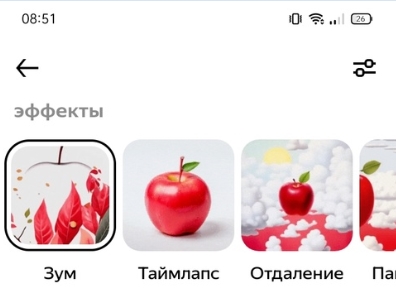 - Выберите один из предложенных эффектов: Зум, Таймлапс, Отдаление, Панорама, Подъем, Морфинг, Вращение. На каждый из них есть предпросмотр;