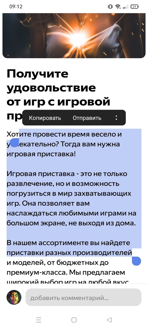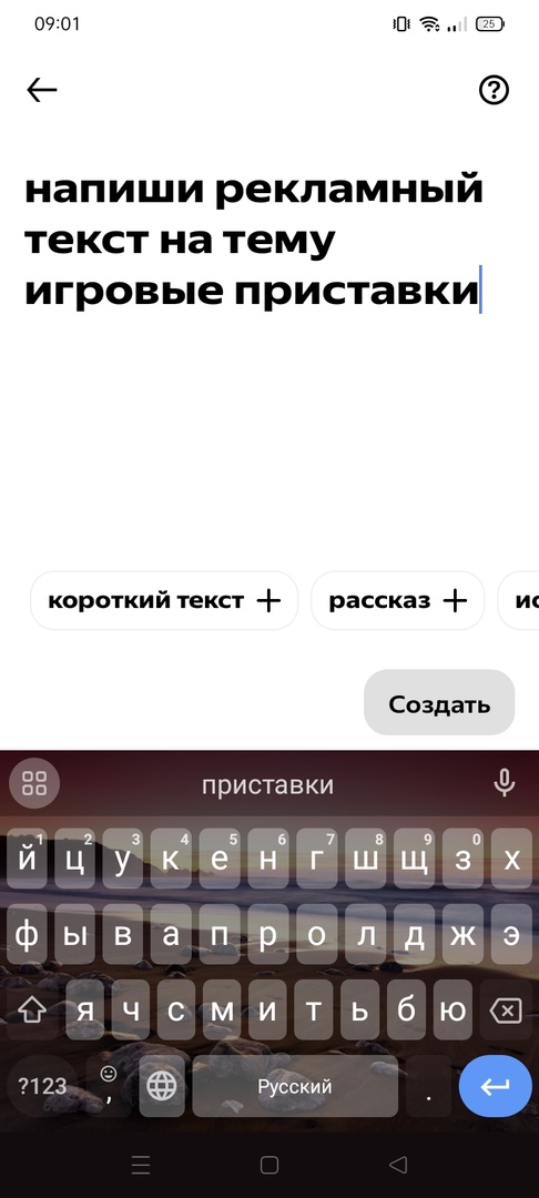 - Введите интересующую вас тему. Мы использовали следующий пробный запрос «Напиши рекламный текст на тему игровые приставки». По желанию выберите уточняющие элементы, к примеру, короткий текст, стих, песня, шутка и т. д. Это позволит нейросети конкретнее понять, что вы хотите получить в итоге;