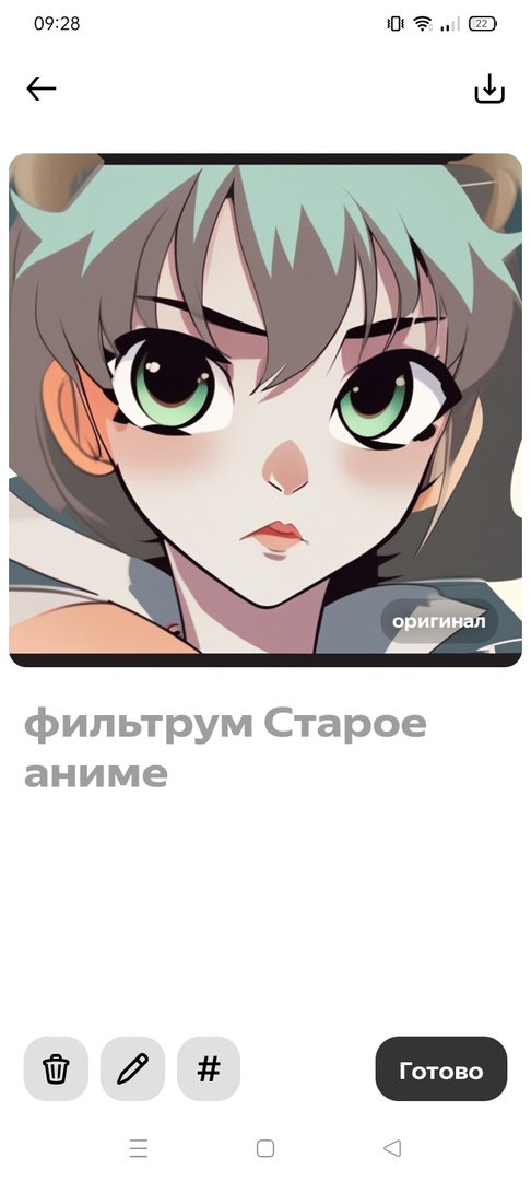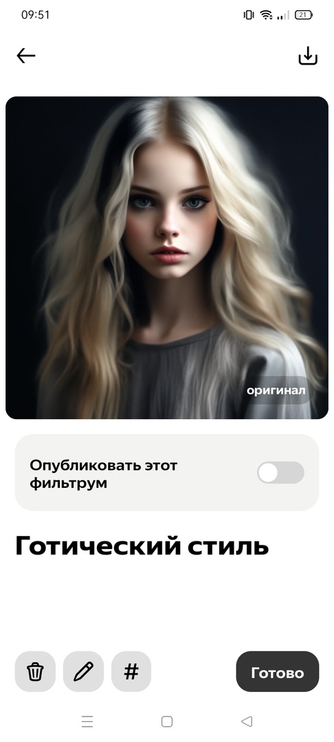 - Дождитесь генерации изображения с фильтумом и, если вы довольны результатом, нажмите «Готово» для его публикации. Если нет, можете отредактировать его или удалить, кликнув по соответствующему значку.