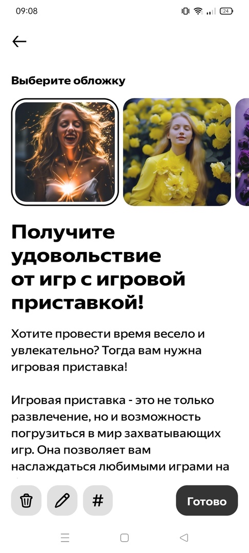- Далее вы можете выбрать обложку для вашего текста из предложенных нейросетью вариантов. Можно создать свою обложку или отказаться от нее вообще;