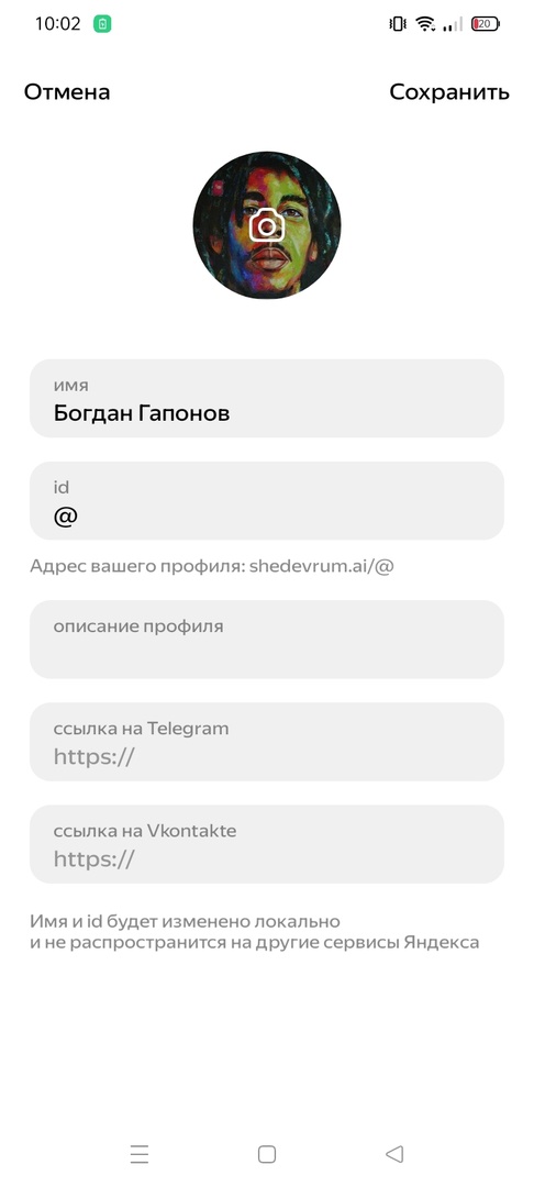 - Как изменить никнейм и аватарку в Шедевруме? Перейдите в свой профиль, кликнув по аватарке в правом нижнем углу экрана. Нажмите на карандашик возле изображения своего профиля и настройте его так, как вам хочется. Там же можно добавить ссылки на свой Телеграм и ВК.