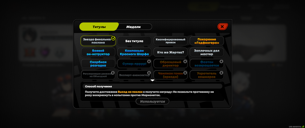 - Изменить титул - в этом разделе вы можете ознакомиться с тем, какие именно титулы вам доступны для использования. Выбирать можно только те, что открыты вам. А если посмотреть на те, что неактивны для выбора, то можно увидеть, какие условия необходимы для получения заветного титула. Для использования можно активировать всего лишь один вариант.
