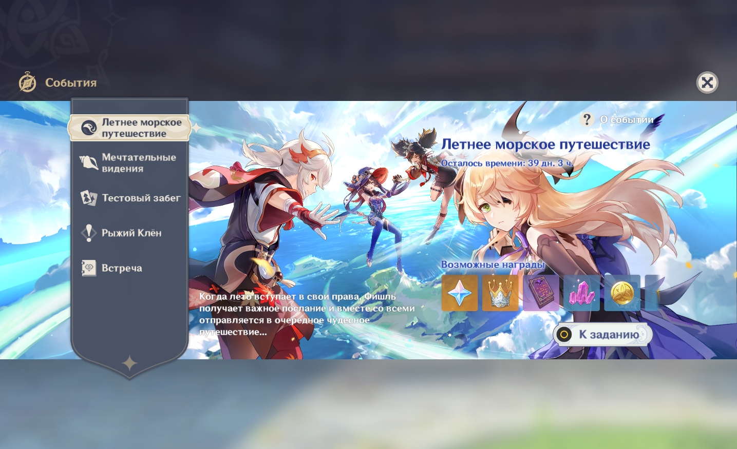 Чтобы получить Фишль, вам необходимо собрать 2400 Перламутровых раковин. Их выдают в качестве награды за зачистку подземелий Призрачного царства. О том, как пройти все испытания, мы рассказали в предыдущем разделе этой статьи. Накопив достаточно Перламутровых раковин, откройте баннер события «Летнее морское приключение» и кликните по значку «Приглашение принцессы».