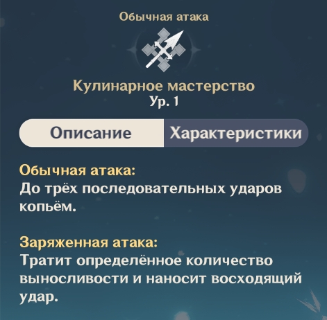 После использования элементального навыка персонаж на 10 секунд получает прибавку к силе атаки в размере 20%~35%. Кроме того, его скорость передвижения увеличивается на 10% |