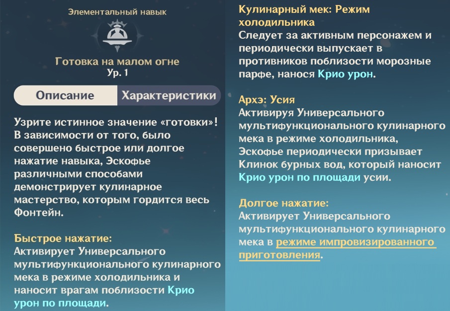 - Архэ: Усия: после активации мека в режиме холодильника Эскофье периодически призывает Клинок бурных вод, наносящий Крио АОЕ урон усии.