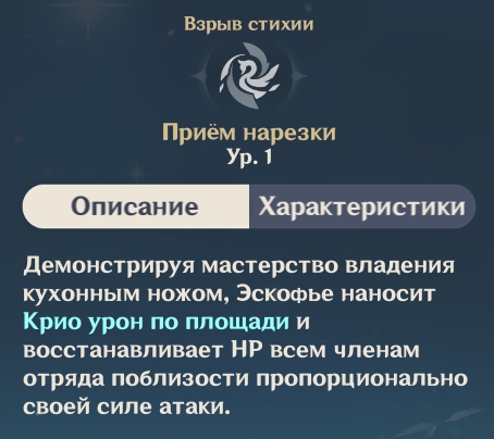 Способность «Прием нарезки» наносит АОЕ урон от Крио и восполняет здоровье всем ближайшим героям в команде в объеме, пропорциональном силе атаки Эскофье.