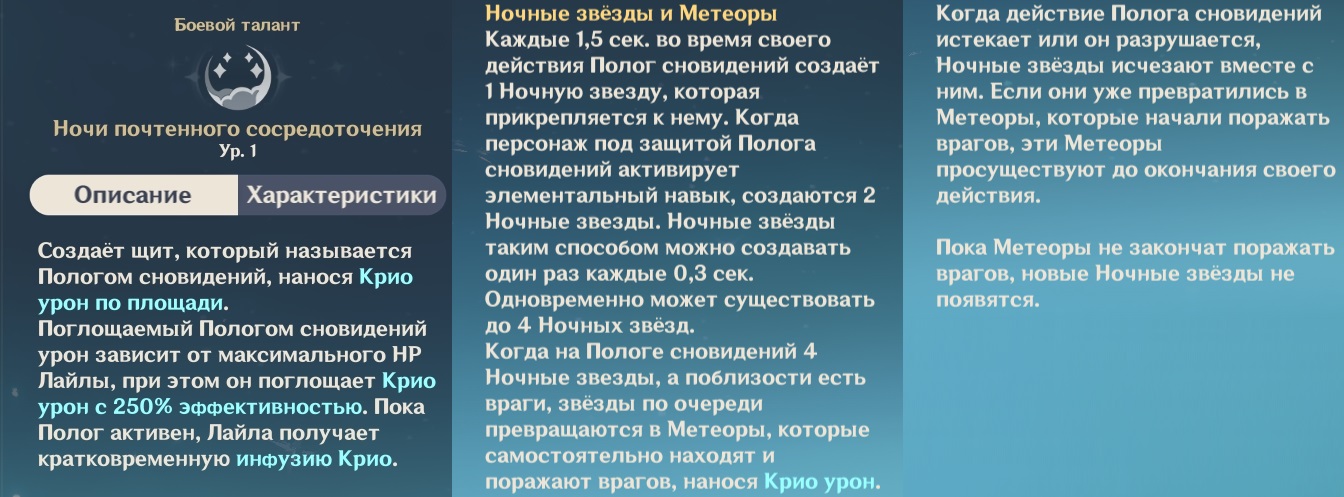 Пример: используйте щит Лайлы и переключитесь на героя стихии Гидро (Тарталья, Мона и т. д.). Наносите урон способностями гидро-персонажа, накладывая на противников статус «Мокрый», а Ночные звезды будут сами атаковать их и вызывать реакцию «Заморозка».