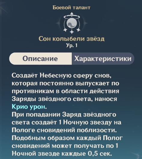 - Умение «Ночи почтенного сосредоточения» продолжает действовать после переключения активного героя. Ночные звезды – отличный источник дополнительного стихийного урона и если в вашем отряде главным ДПС является гидро-герой, то они обеспечат постоянную активацию реакции «Заморозка».
