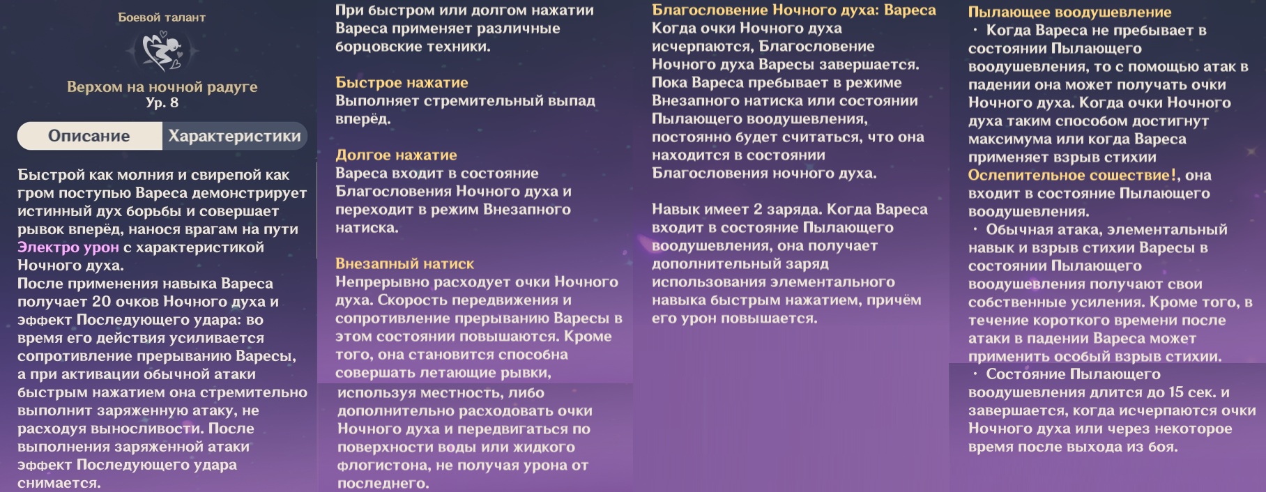 «Верхом на ночной радуге» имеет два заряда. Когда Вареса получает «Пылающее воодушевление», у нее появляется дополнительный заряд навыка (быстрое нажатие), а его урон увеличивается.