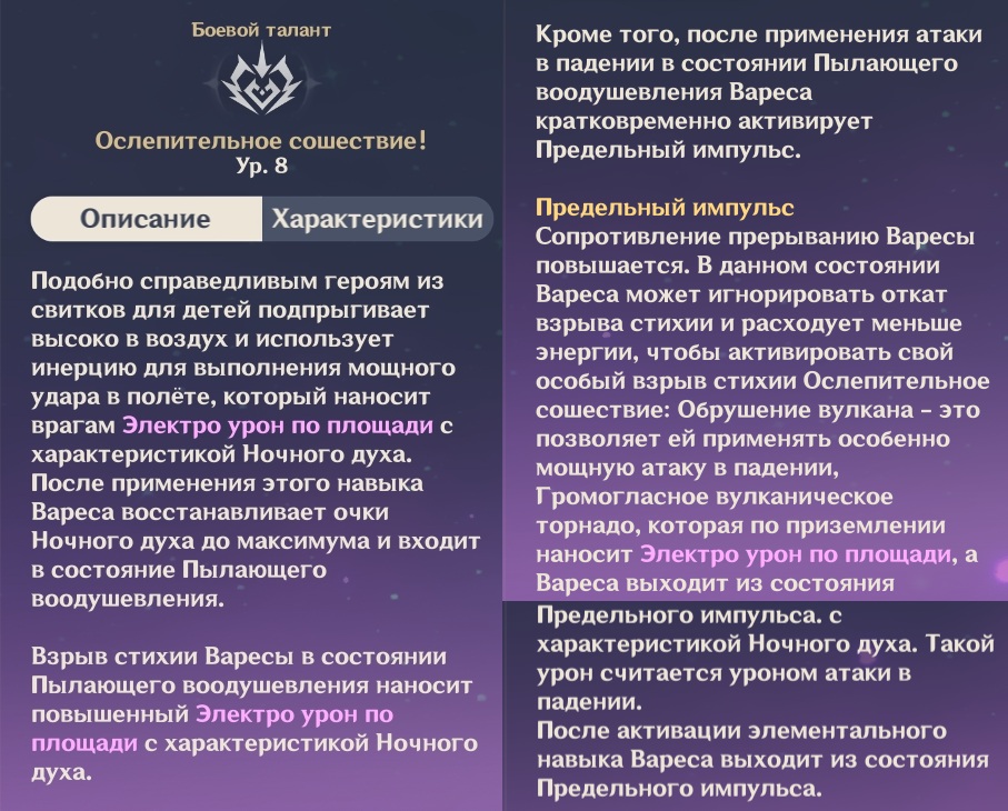 - Позволяет игнорировать время восстановления ультимейта и уменьшает затраты энергии на активацию особого взрыва стихий «Ослепительное сошествие: Обрушение вулкана». Это дает возможность использовать особо мощную атаку в падении «Громогласное вулканическое торнадо», наносящее АОЕ-урон от Электро с характеристикой Ночного духа при приземлении Варесы и выводящее ее из состояния «Предельный импульс». Этот урон считается уроном атаки в падении;