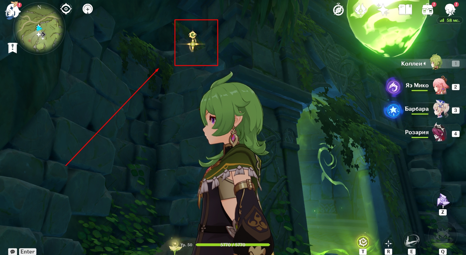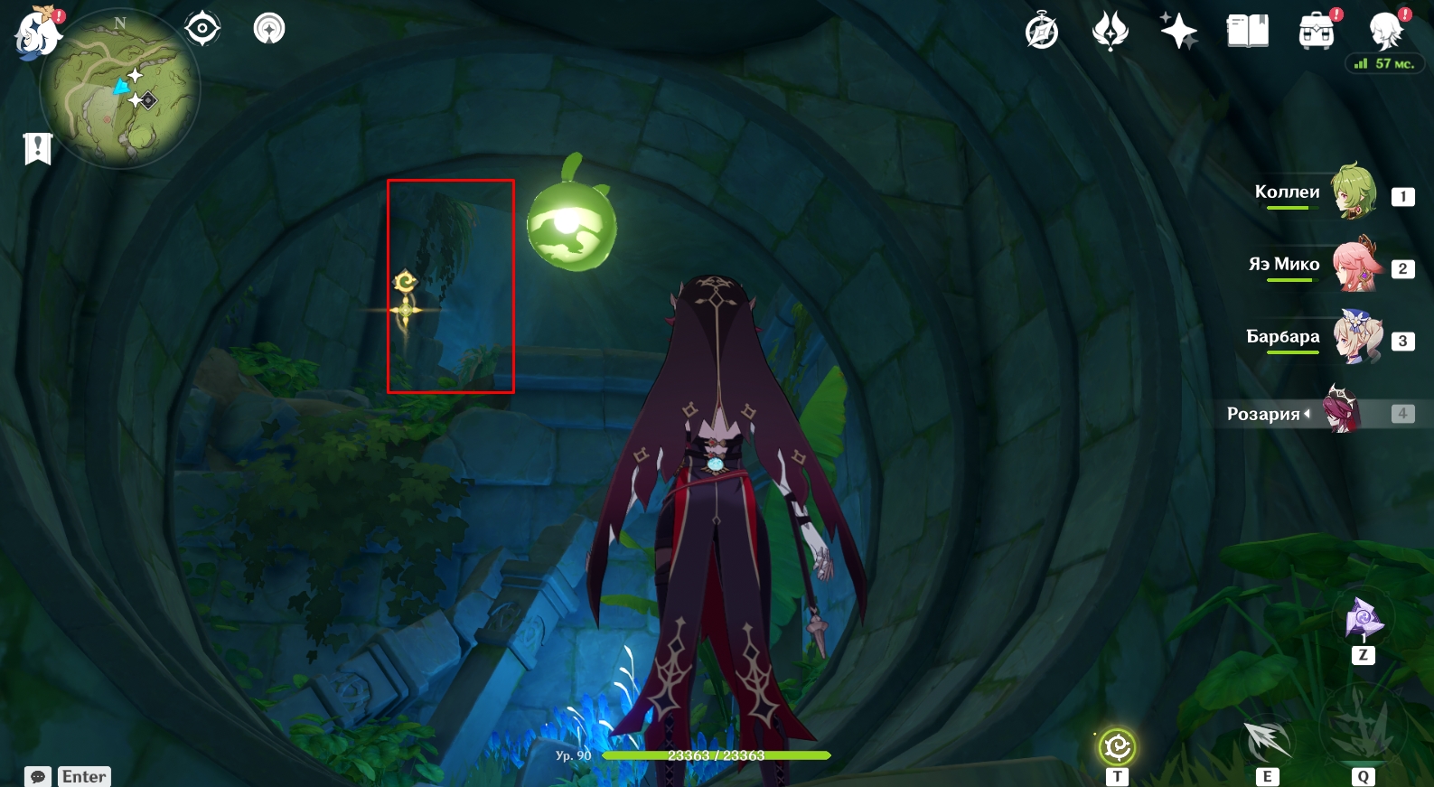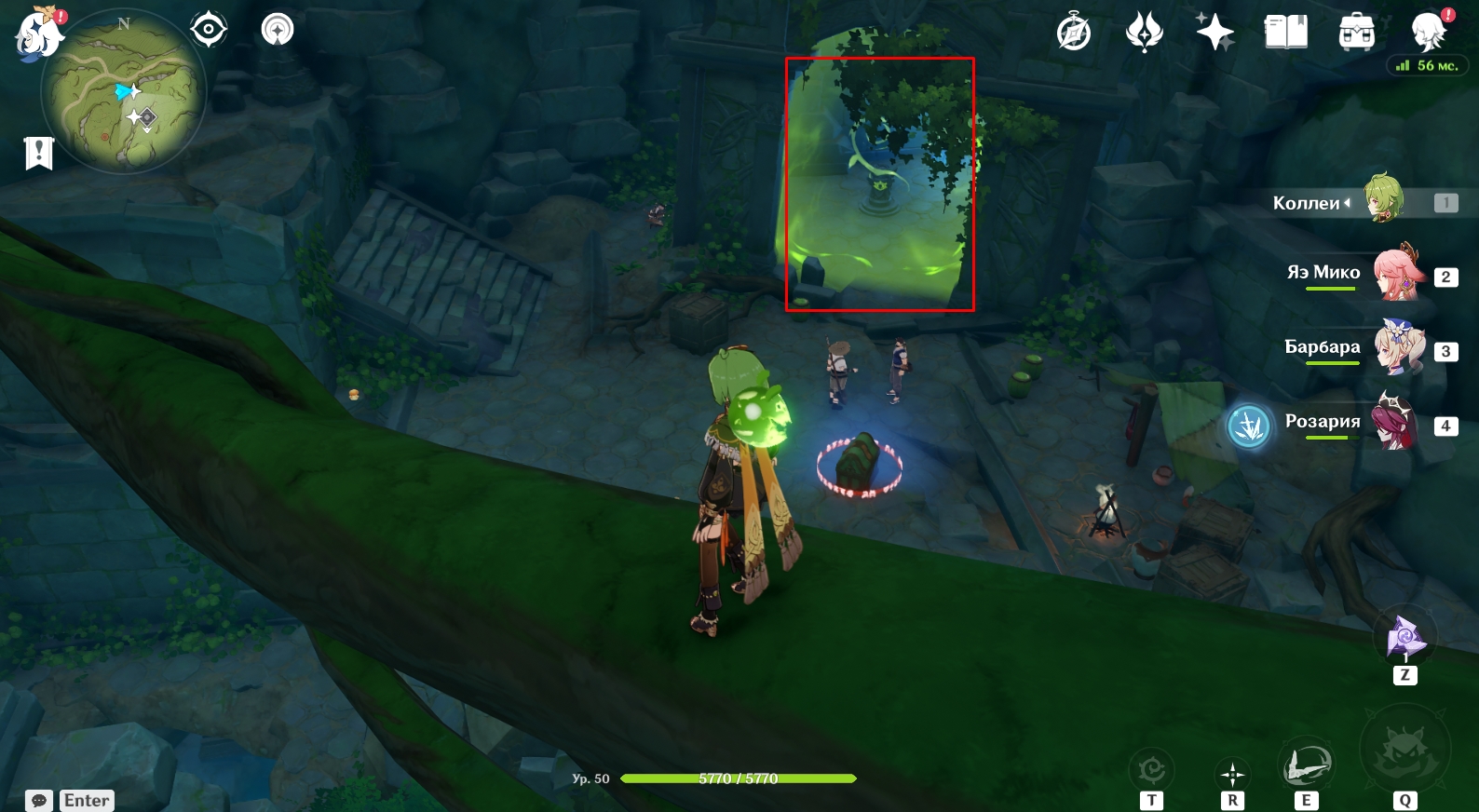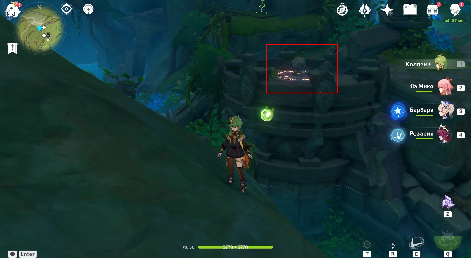 В конце туннеля находится огромная пещера с руинами древнего строения. Поверните налево и активируйте элементальный монумент Дендро. Для этого ударьте по нему стихийным умением любого дендро-героя (Коллеи, Тигнари или Путешественника). Далее поднимитесь наверх и победите Охотников за сокровищами возле зеленого барьера, иначе они будут мешаться в будущем. Теперь подойдите к зеленому барьеру и поверните налево. Посмотрите вверх. Там есть четырехлистный символ, за который можно зацепиться и попасть в комнату за барьером, чтобы активировать еще один элементальный монумент Дендро.