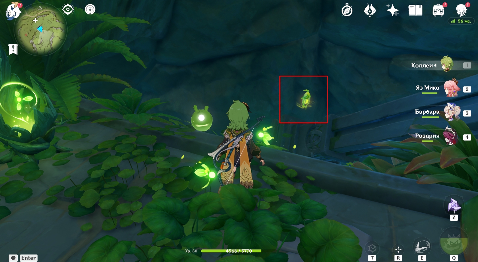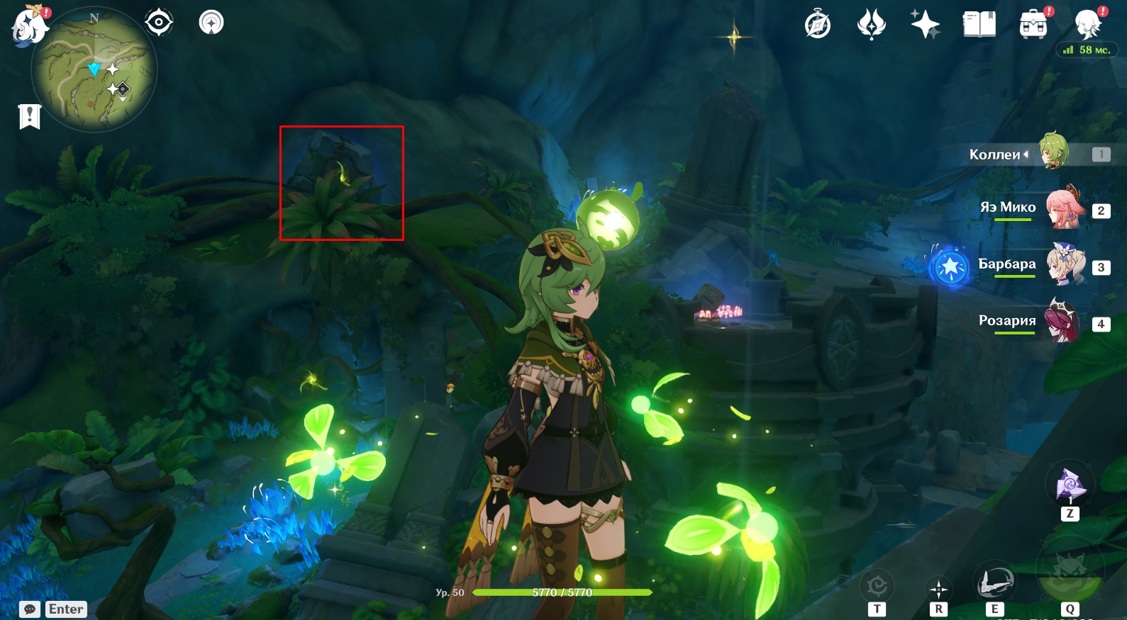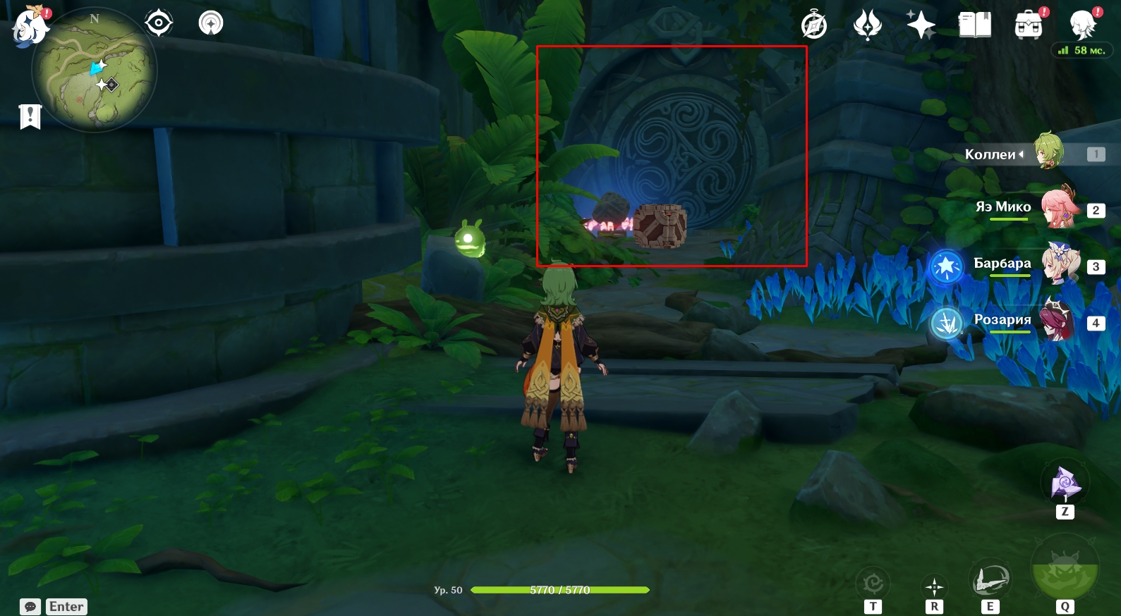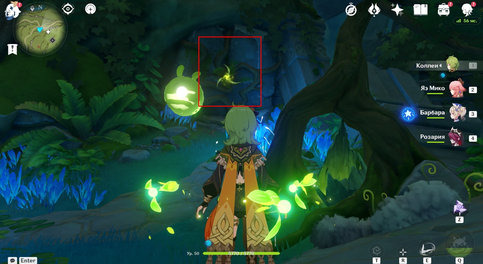 В конце туннеля находится огромная пещера с руинами древнего строения. Поверните налево и активируйте элементальный монумент Дендро. Для этого ударьте по нему стихийным умением любого дендро-героя (Коллеи, Тигнари или Путешественника). Далее поднимитесь наверх и победите Охотников за сокровищами возле зеленого барьера, иначе они будут мешаться в будущем. Теперь подойдите к зеленому барьеру и поверните налево. Посмотрите вверх. Там есть четырехлистный символ, за который можно зацепиться и попасть в комнату за барьером, чтобы активировать еще один элементальный монумент Дендро.