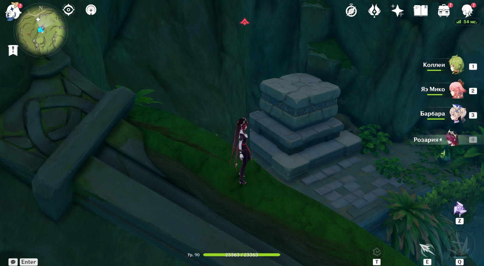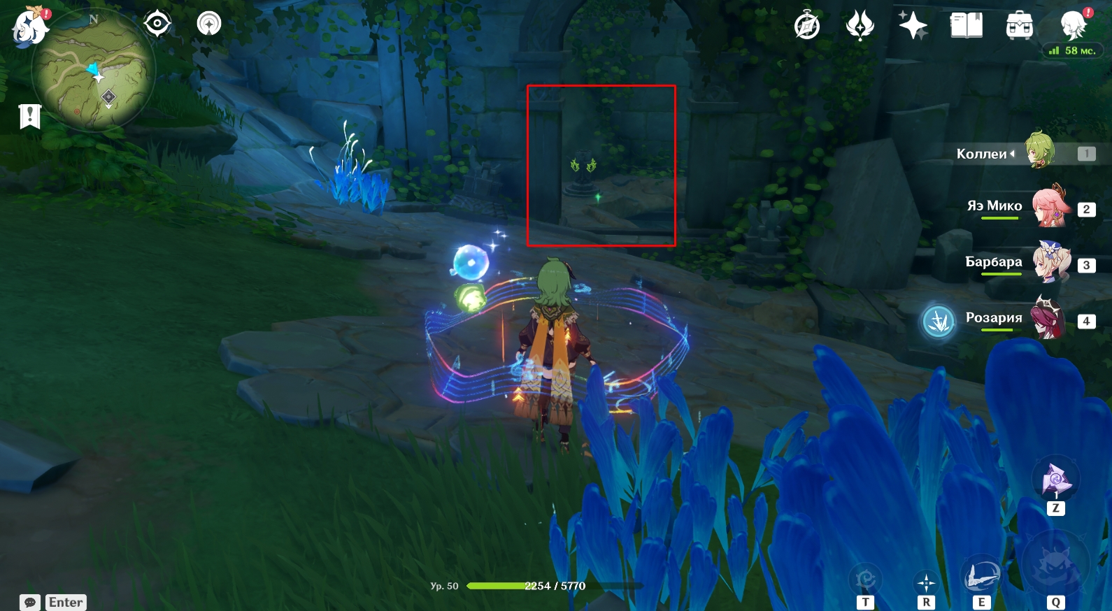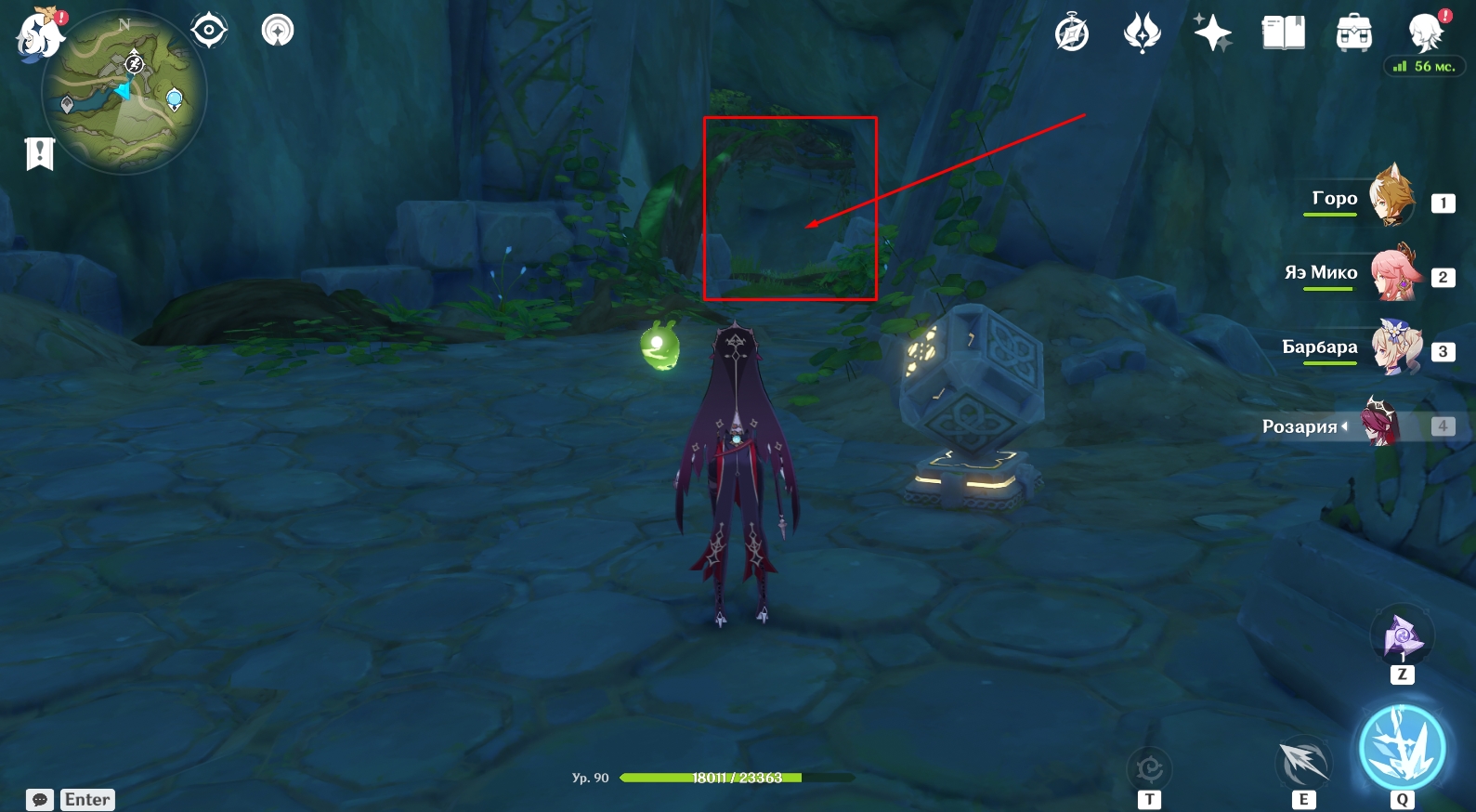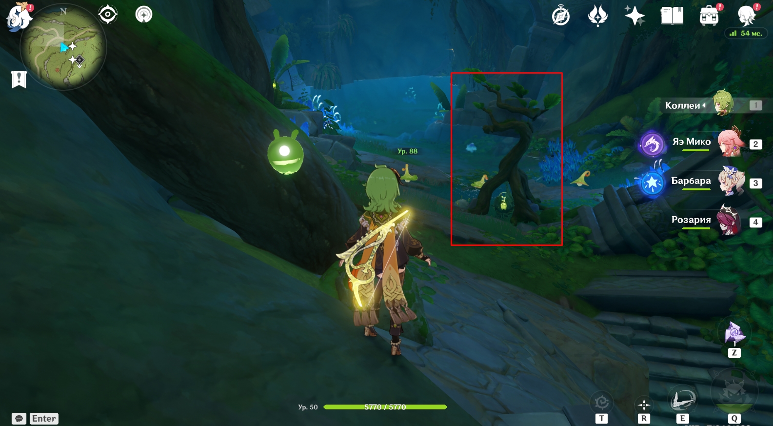 В конце туннеля находится огромная пещера с руинами древнего строения. Поверните налево и активируйте элементальный монумент Дендро. Для этого ударьте по нему стихийным умением любого дендро-героя (Коллеи, Тигнари или Путешественника). Далее поднимитесь наверх и победите Охотников за сокровищами возле зеленого барьера, иначе они будут мешаться в будущем. Теперь подойдите к зеленому барьеру и поверните налево. Посмотрите вверх. Там есть четырехлистный символ, за который можно зацепиться и попасть в комнату за барьером, чтобы активировать еще один элементальный монумент Дендро.