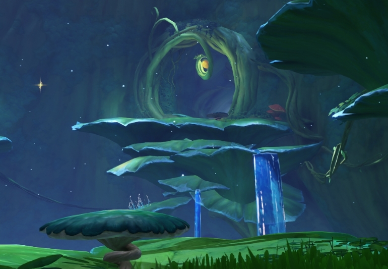 Сразу с правой стороны вы увидите нескольких монстров, феечку и заблокированный механизм. Убейте врагов и взаимодействуйте с кубом. После этого уровень воды в реке под водопадом понизится.